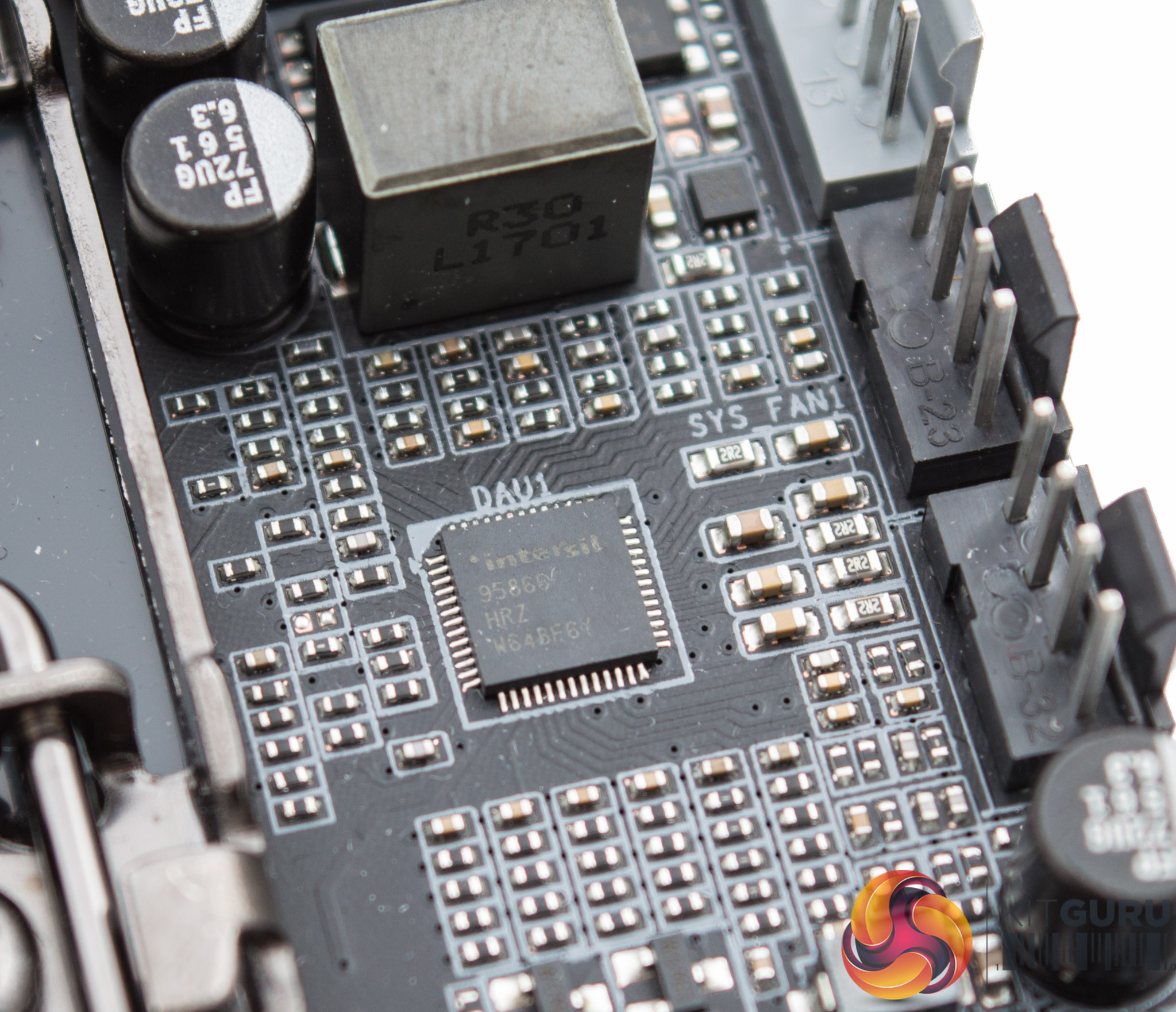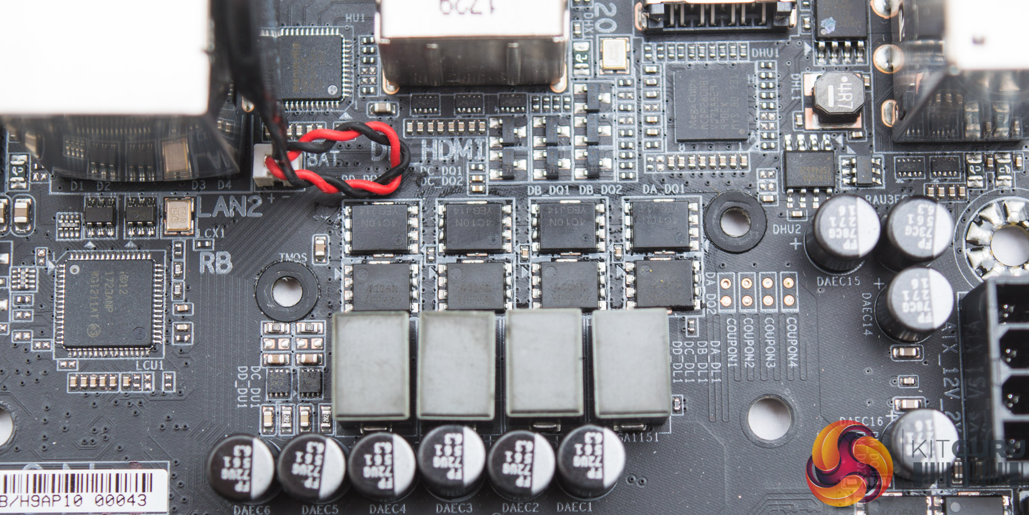 The CPU has a 4+2 phase design using an Intersil ISL95866 hybrid-digital PWM controller, ON Semiconductor MOSFETs and six inductors. The four CPU vCore phases have eight NTMFS4C06N low-side and four NTMFS4C10N high-side MOSFETs while the two iGPU phases use two NTMFS4C06N low-side and two NTMFS4C10N high-side MOSFETs.