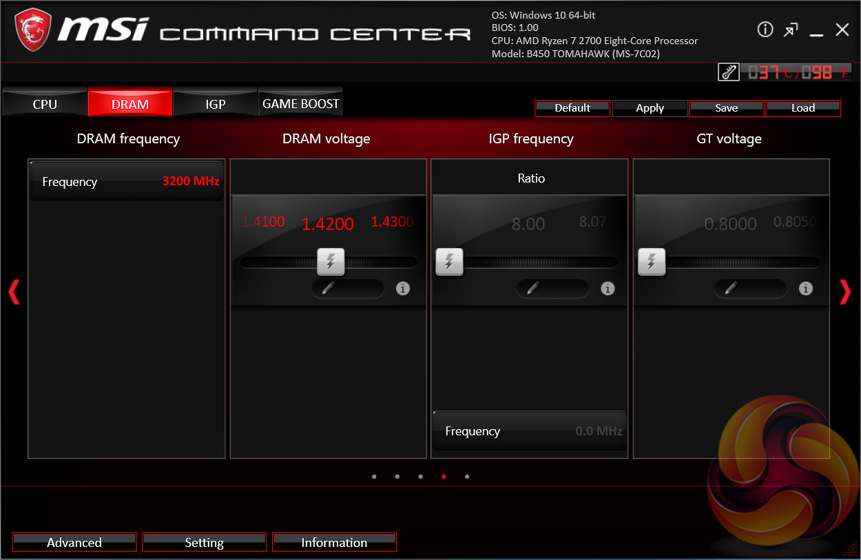 Command Center is the Windows performance tuning software for the MSI B450 Tomahawk with on-the-fly overclocking tools for the CPU, DRAM and iGPU, as well as fan controls. The virtual Game Boost button can also be toggled from within here but we find for the effort required users are better off doing some quick research to overclock their CPU since MSI has to overestimate the voltage to account for variations across all CPUs which usually results in considerably more voltage than is necessary being applied.