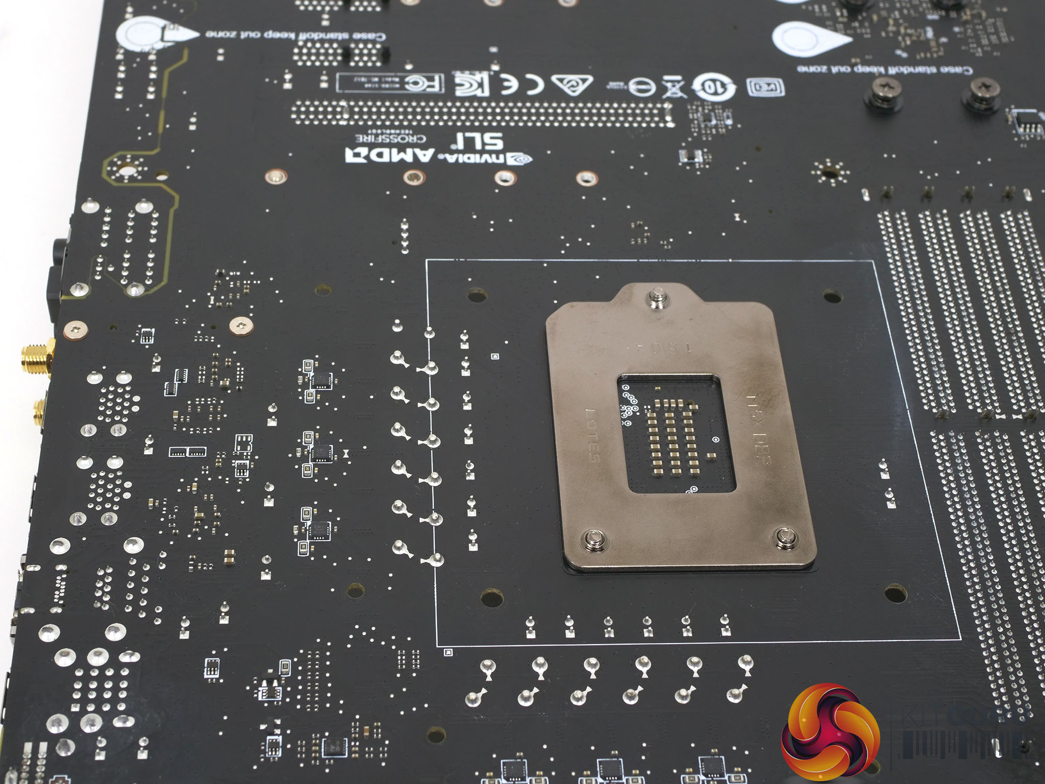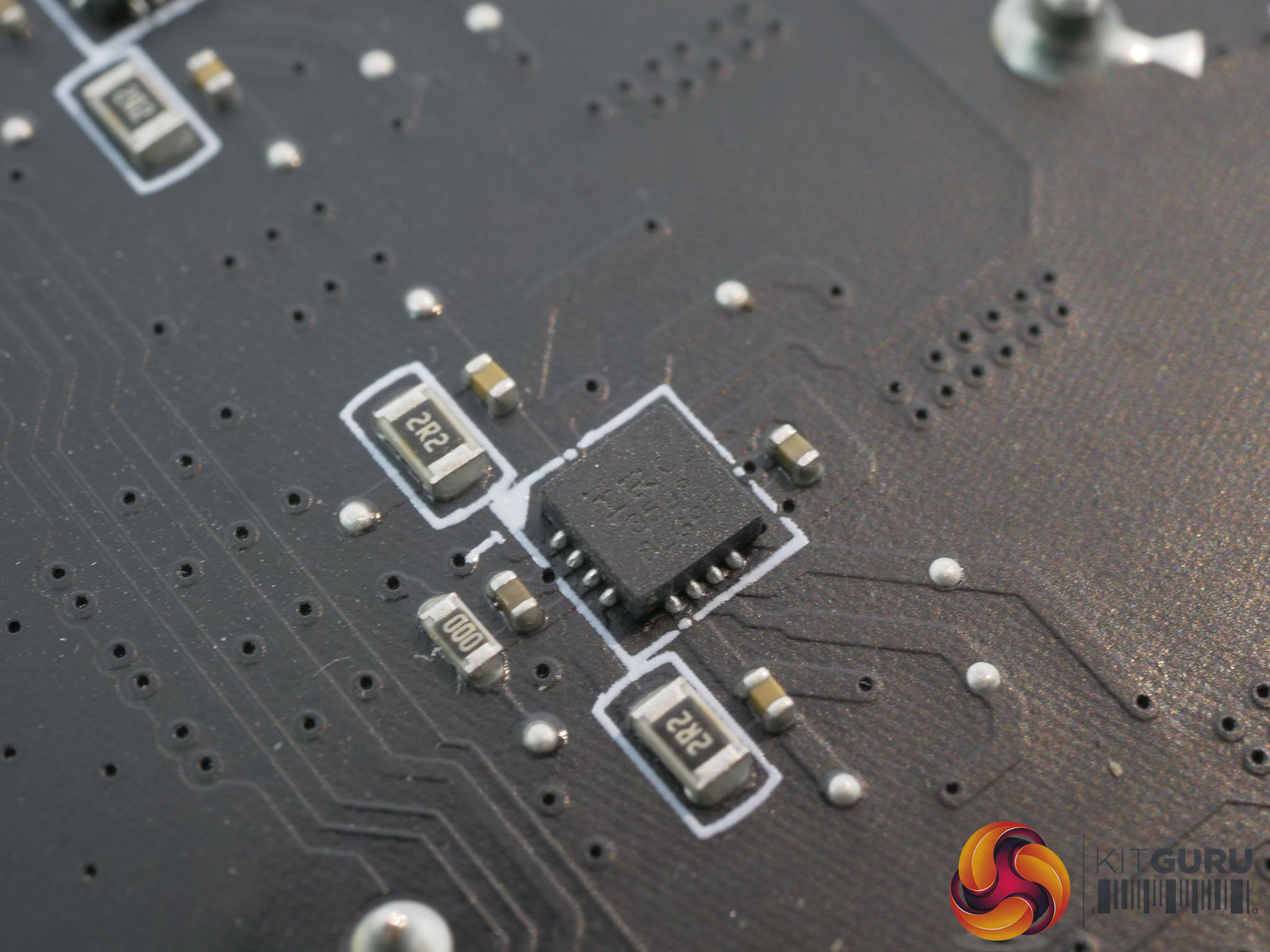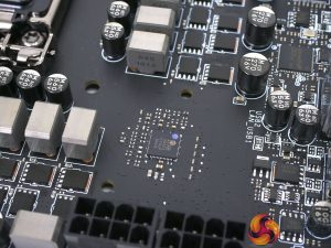 There are six IR3598 phase doublers found on the underside of the motherboard which support the doubling of 6 PWM signals to 12 PWM phases.
