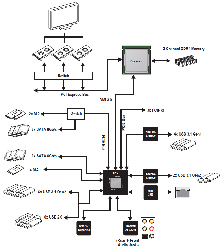 MSI provides all the full-size PCIe slots from the CPU PCIe lane allocation while everything else (USB 3.1 ports, SATA III, M.2, audio and networking) is provided from the chipset PCIe lane allocation, using bandwidth switching where necessary.