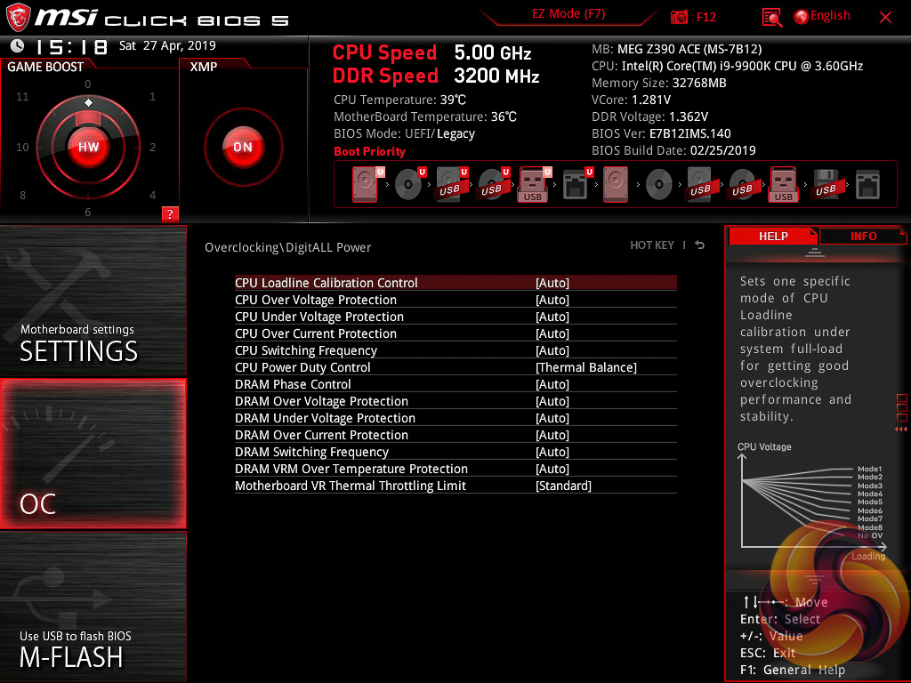 The range of LLC options is extensive too, with Mode 1 (most aggressive) to Mode 8 (least aggressive) as well as an option for No overvolting, which is even less aggressive on the voltage than Mode 8. From our testing with override voltages, mode 3 ensures no droop from what is programmed in the BIOS, if anything it rises a little higher than what's specified, while mode 4 ends up being slightly under. The visual diagram MSI provides within the BIOS is useful in ascertaining the approximate behaviour of each CPU LLC mode.