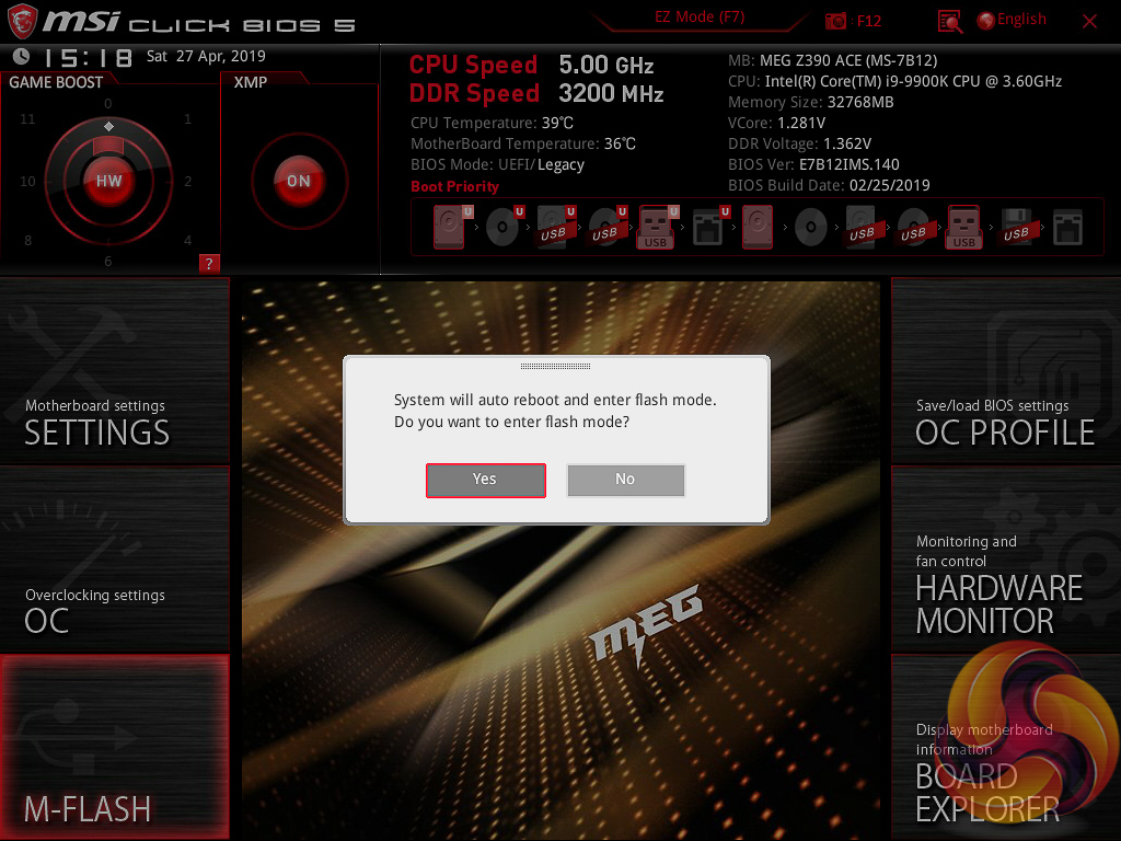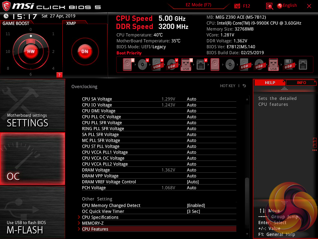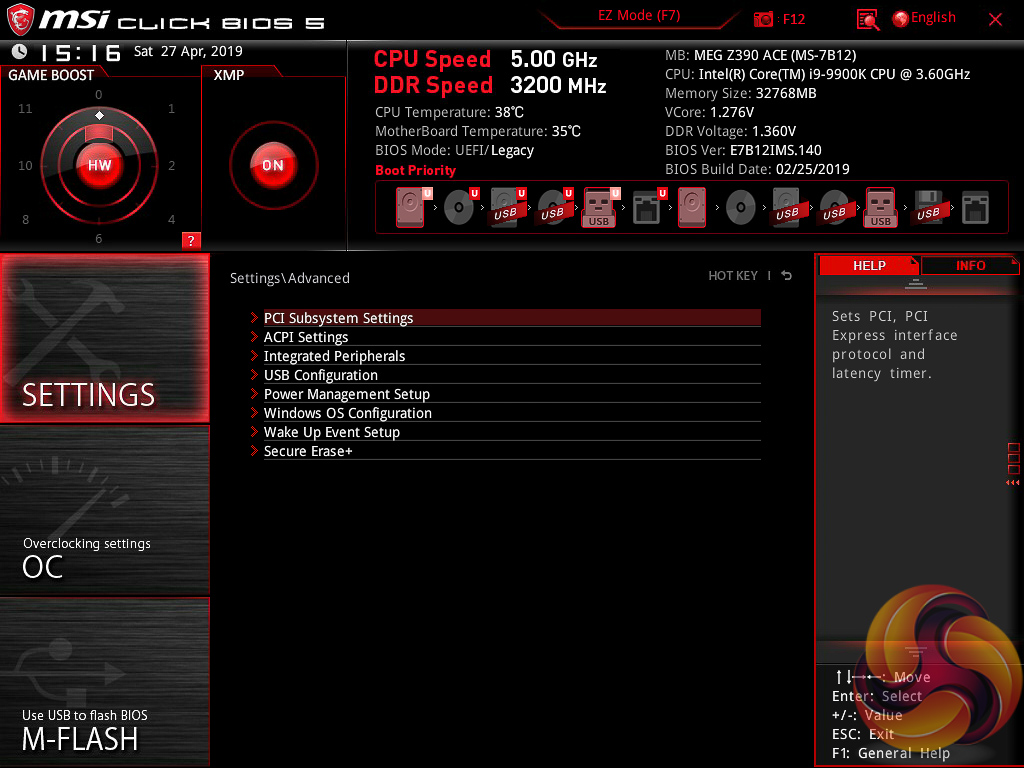 MSI’s UEFI has remained relatively consistent across its range of high-end motherboards for Intel platforms for the last few years. The MSI MEG Z390 ACE sports version 5 of MSI’s Click BIOS which launches into an EZ Mode splash screen with an option to head into the advanced mode with the press of F7.