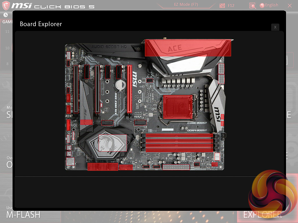 The last two tiles of the MSI UEFI refer to visual tools. Board Explorer is a visual interface for seeing what is connected to the various sections of the motherboard and some information about those connected entities. Hardware Monitor has more practical use in that it’s the primary method of changing fan profiles within the UEFI environment for each of the seven fan headers.