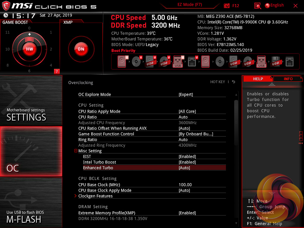 MSI has an “enhanced Turbo” setting that is working away in the background under the guise of “Auto” from the get-go, whether an XMP profile is set or not. Somewhat surprising is the fact that even if you disable enhanced Turbo, MSI still flouts Intel's Turbo specification and locks the Turbo frequency in at 4.7GHz all-core on the Core i9 9900K, well beyond the rated 95W TDP. For reference a typical Intel Turbo runs at 4.6~4.7GHz all-core for about 30 seconds before backing down to around 4.2~4.3GHz.