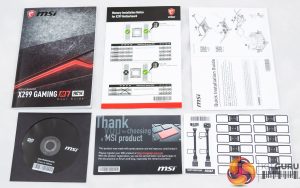 The documentation bundle includes guidance on memory installation which varies depending on the CPU as some of Intel's lower-end models (Kaby Lake-X) only support 4 out of 8 DIMM slots whereas the high-end models (Skylake-X) support the full complement of 8 lanes. The full extent of the accessory package is as follows: