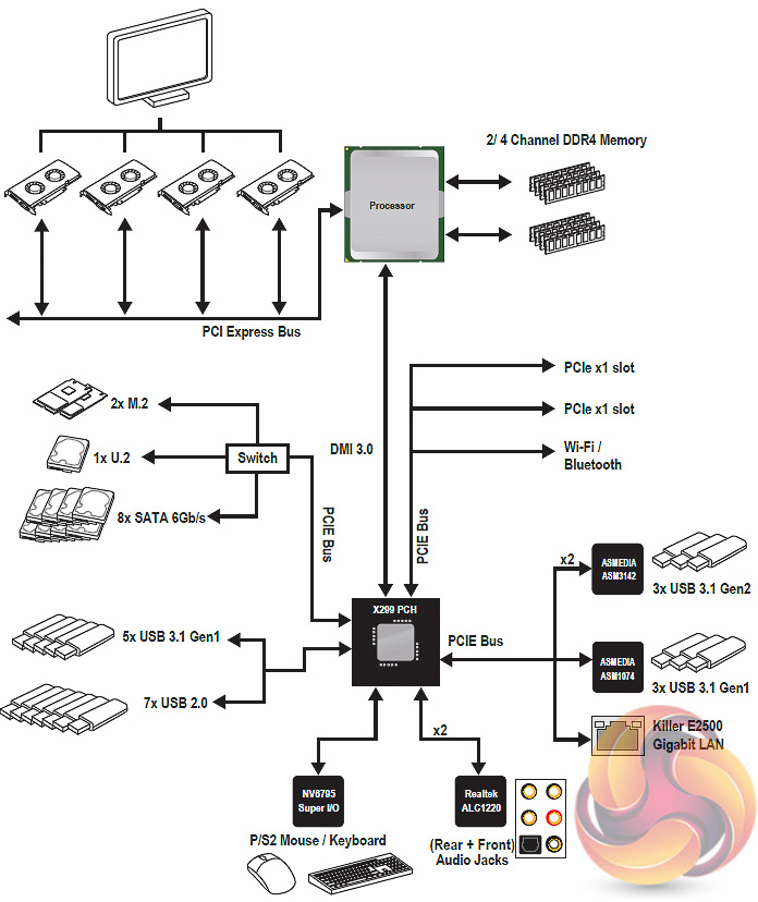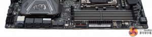 MSI provides four PCIe 3.0 x16 slots with two PCIe 3.0 x1 slots sharing their space with the dual M.2 ports. Those four PCIe 3.0 x16 slots support “only” a 3-way graphics configuration and contribute to an incredibly complex bandwidth allocation balancing act across the motherboard that will vary depending on whether the CPU is a 44- or 28-lane Skylake-X or 16-lane Kaby Lake-X unit.