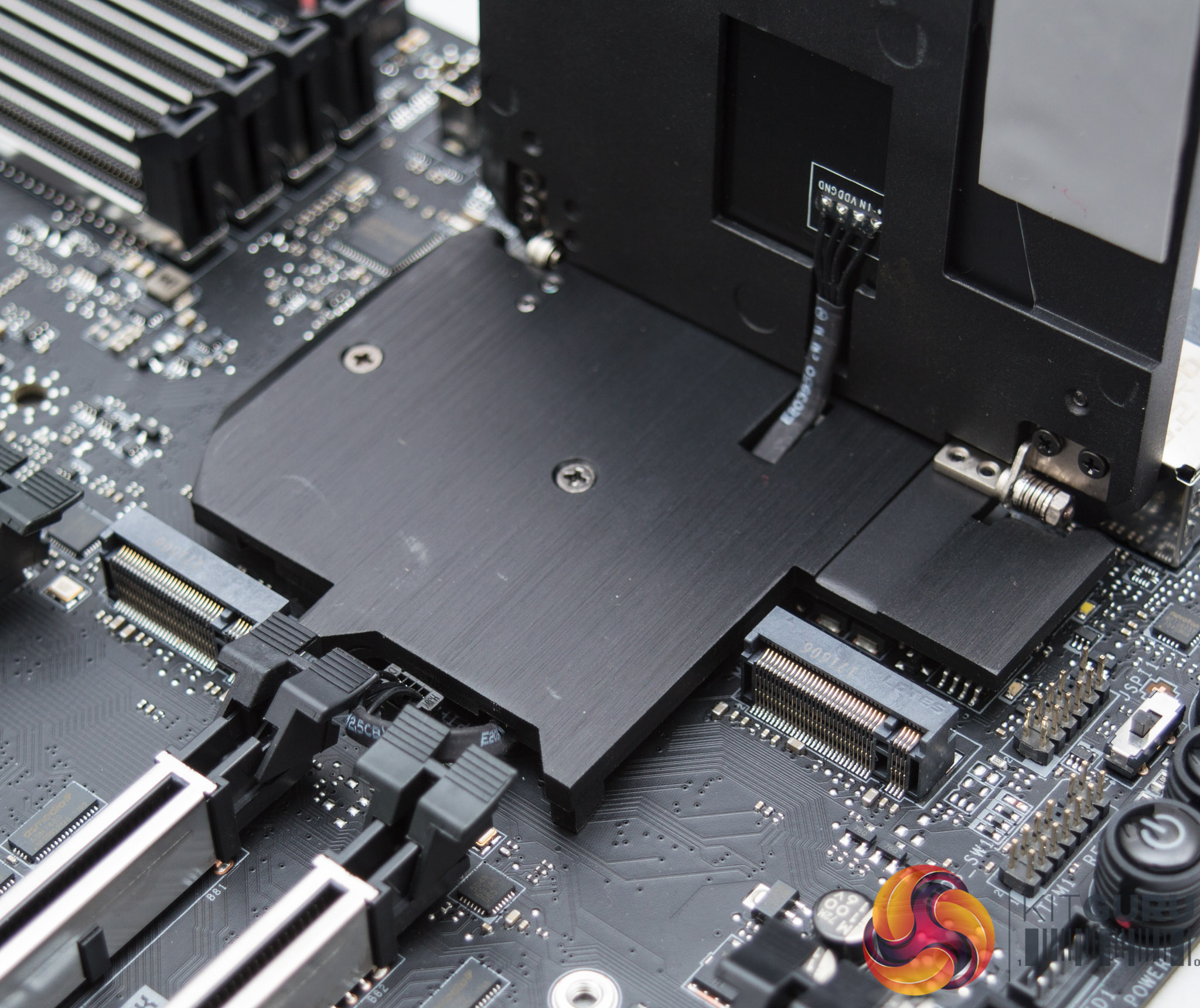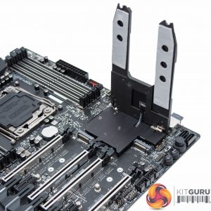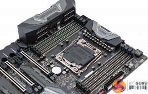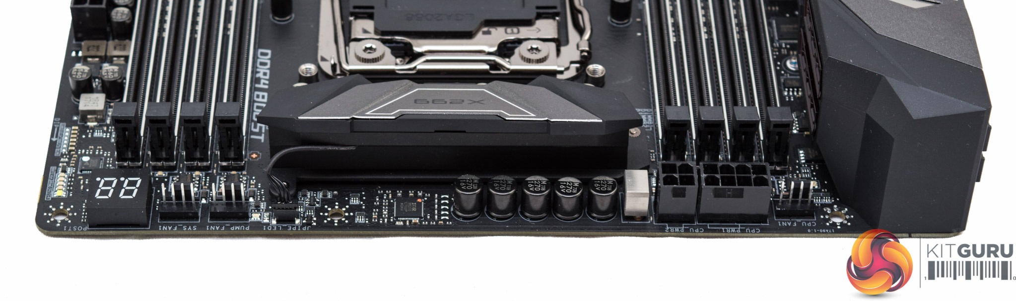 The heatsink that covers the CPU VRM is a rather compact offering since space constraints for Intel's LGA 2066 socket and DIMM slots dictate the maximum extent of the cooling solution. There have been industry grumblings about the longevity of some X299 VRM solutions but given how well-engineered this motherboard power circuitry is even a heavily overclocked i9 7900X fails to work the VRM significantly hard. Perhaps LN2 workloads or Intel's 14, 16 and 18-core CPUs will tell a different tale.