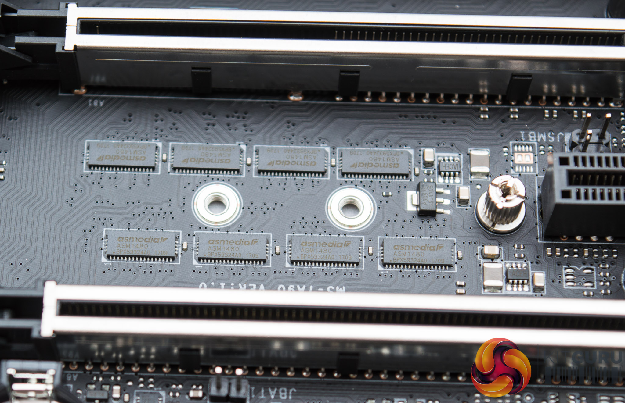 A number of ASMedia ASM1480 chips sit in between those PCIe lanes taking responsibility for switching PCIe bandwidth between lanes depending on the chosen hardware configuration.
