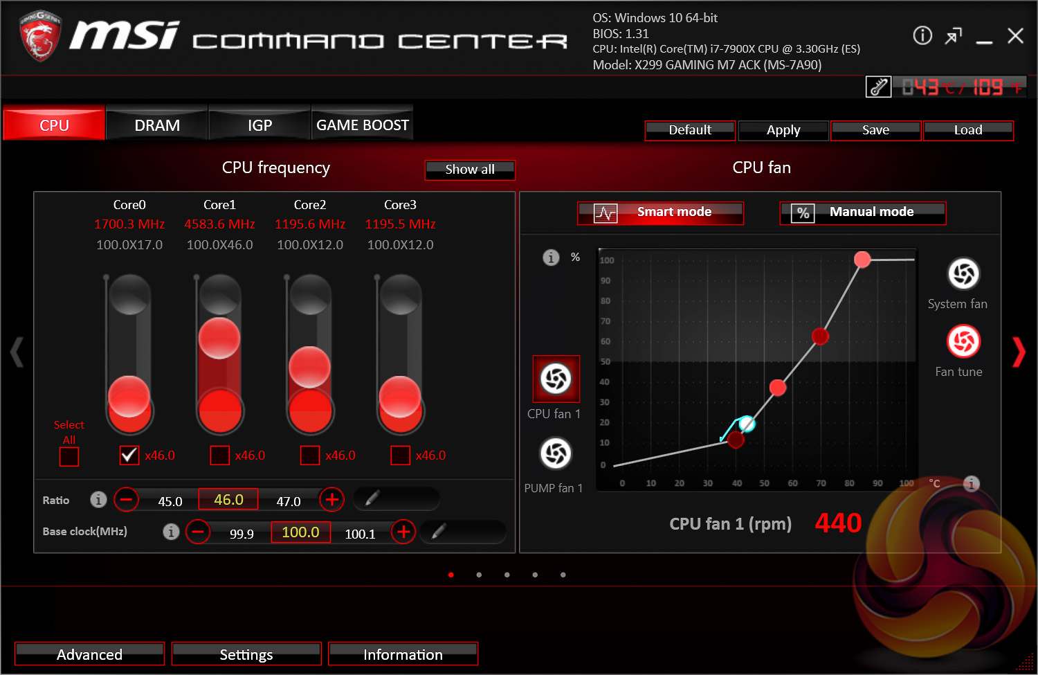 Command Center is the Windows performance tuning software for the MSI X299 Gaming M7 ACK housing on-the-fly overclocking tools for the the CPU, DRAM and iGPU and fan controls. The virtual Game Boost button can also be toggled from within here but we find for the effort required users are better off doing some quick research to overclock their CPU since MSI has to overestimate the voltage to account for variations across all CPUs which usually results in considerably more voltage than is necessary being applied.