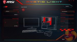 MSI Mystic Light is the primary LED controlling functionality but it left us underwhelmed for the high-end motherboard this is. The user cannot set each of the single lighting modes (breathing, flashing, etc.) to display more than 1 colour at a time – 1 colour per mode so having multi-coloured lighting effects like a “rainbow” effect appears to be out of the question. The range of colours is impressive enough as you can specify colours on an RGB scale but the variety of pre-configured lighting modes and lighting displays is decidedly average.