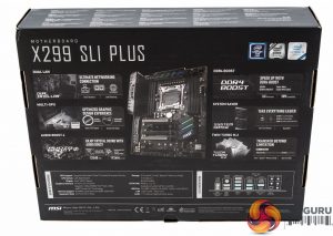 Packaging is clean and understated, like the design of the MSI X299 SLI Plus. Key features highlighted on the box include dual-LAN, high quality Realtek audio, dual M.2 and a range of BIOS features and buttons.