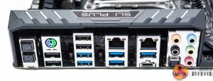 Rear connectivity is very good on X299 which one of the perks of not having to make space for display outputs since integrated graphics are not supported on LGA 2066 CPUs. MSI provides 10 USB ports of varying speeds (2.0, 3.0, 3.1), dual Intel Gigabit Ethernet, the usual audio connections, a legacy PS/2 and two function buttons.
