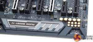 The audio solution uses a single Realtek ALC 1220 codec with an Texas Instruments OP1652 operational amplifier. There are five 10v 100uF and eight 16v 10 uF Nippon Chemicon audio capacitors on the isolated audio PCB section.