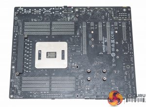 On the rear of the PCB is a range of cross-head screws for easy maintenance and disassembly. Underneath the metal plate are the second half of the low and high-side MOSFETs for the CPU 8-phase VRM solution.