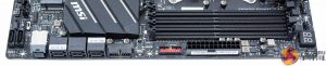 MSI clusters three of the four system fan headers after the last PCIe lane which could be a little tricky for fan cable routing, a fan header or two mid-board would have been a better choice.