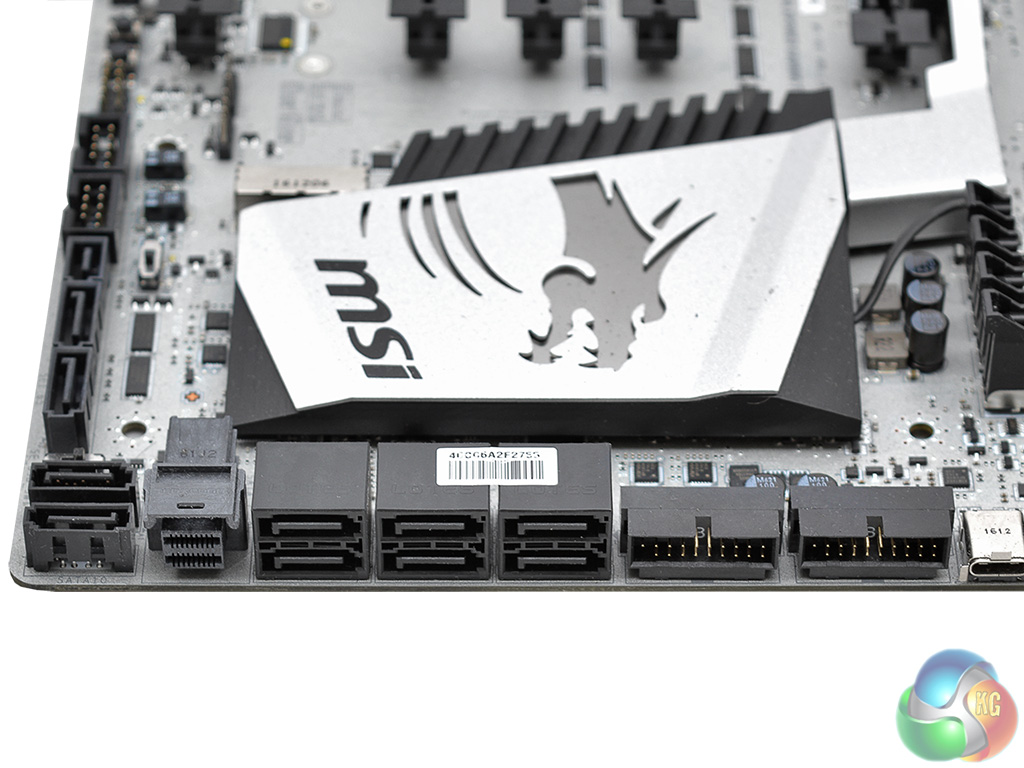 Further down the side of the motherboard you'll find the ten SATA III ports, with SATA Express, a U.2 connection and a pair of right-angled USB 3.0 headers. The mish-mash of right-angled and vertical SATA ports is somewhat confusing and MSI should maintain some consistency in choosing one or the other.