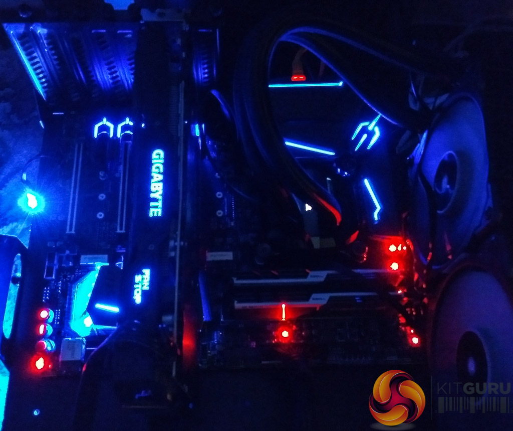 The image above shows the motherboard in a dark room with all the LEDs set to blue, as you can see a number of red lights persist.