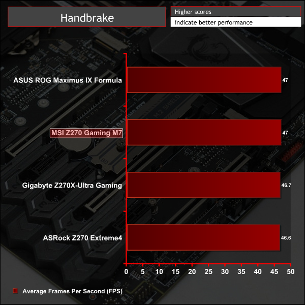 Handbrake is a free and open-source video transcoding tool that can be used to convert video files between different codecs, formats and resolutions. We measured the average frame rate achieved for a task of converting a 6.27GB 4K video using the Normal Profile setting and MP4 container. The test stresses all CPU cores to 100% and shows an affinity for memory bandwidth.