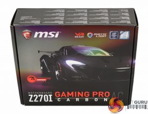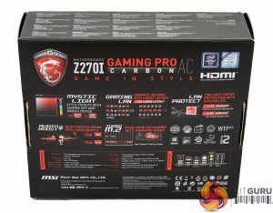 The packaging for the MSI Z270i Gaming Pro Carbon AC is RGB-themed with a focus on the Carbon element of the design. Focal features include the Mystic Light RGB LED system, the NVMe-capable PCIe 3.0 M.2 slot and MSI's gaming LAN solution which is effectively a marriage of Intel's I219-V Network Interface Controller and their Gaming LAN manager software.