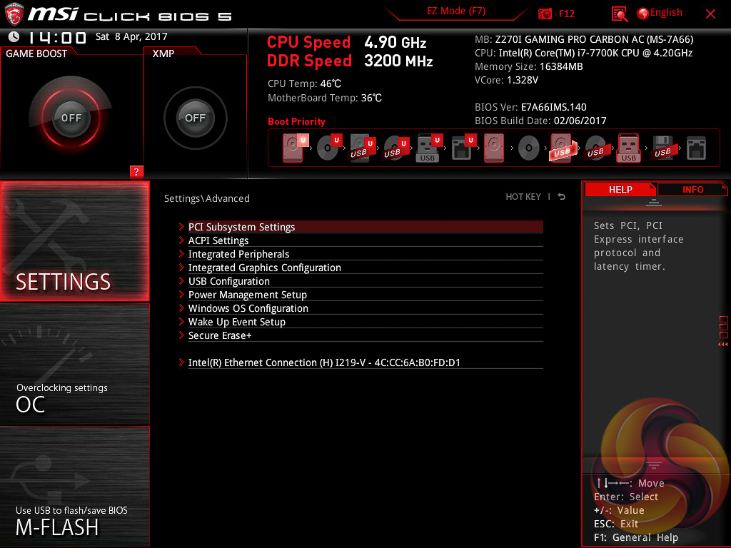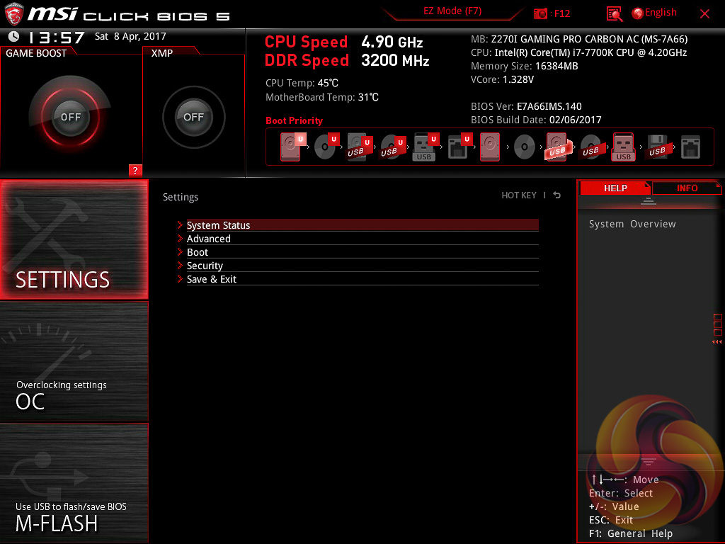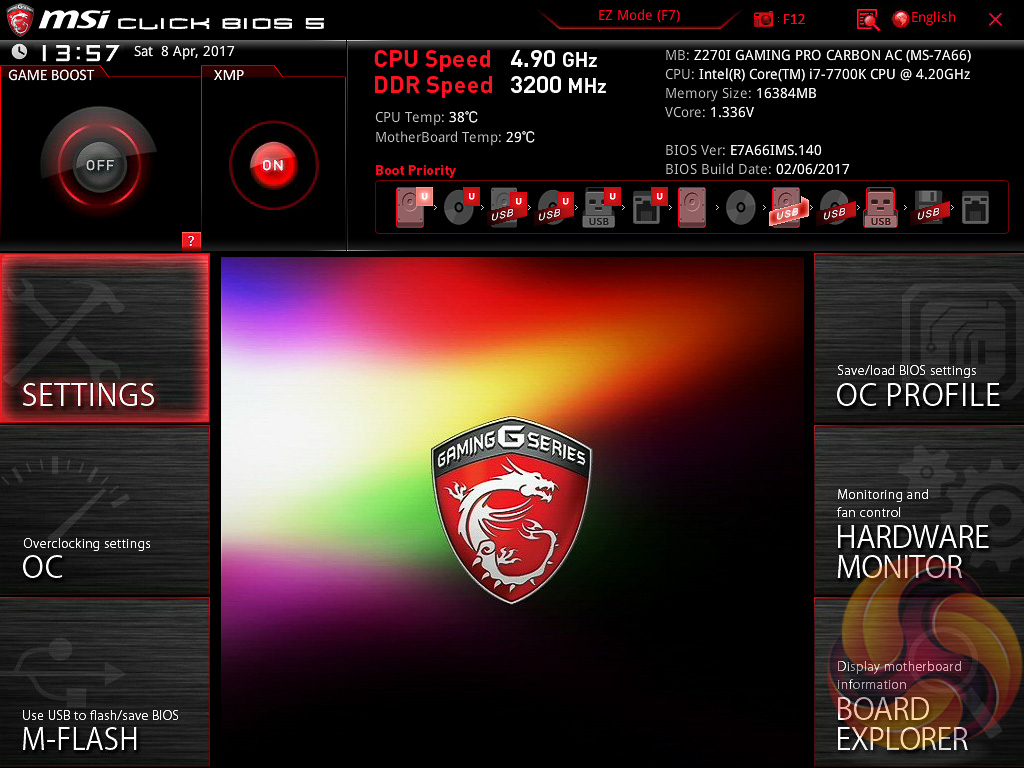 MSI’s UEFI launches into EZ Mode by default, but can launch into Advanced mode instead by pressing F7. The EZ Mode splash page holds the key settings like automated overclocking, boot order, fan profiles, M-Flash and XMP.