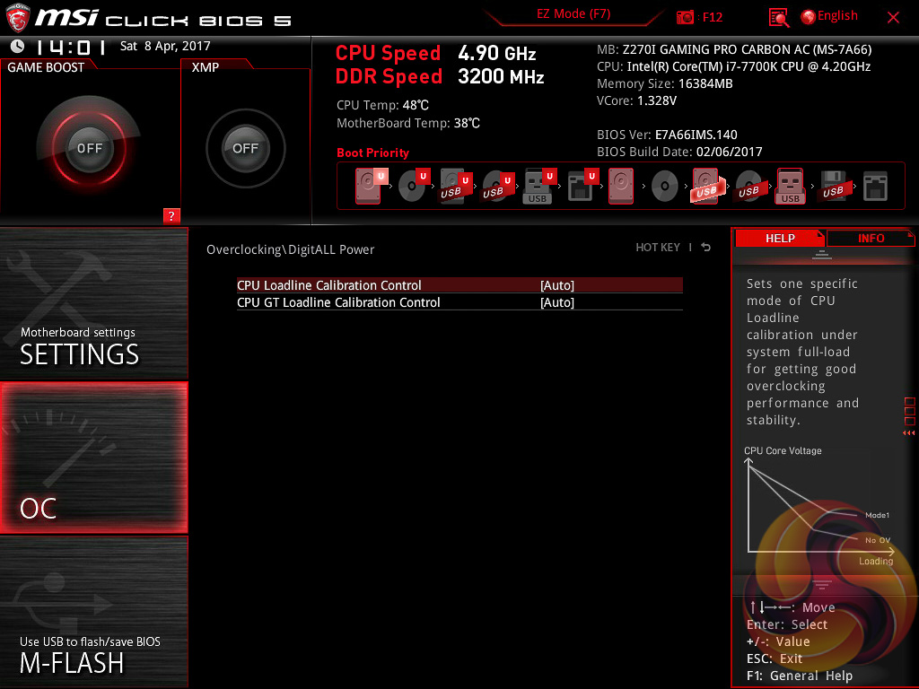 MSI allows only two levels of LLC control with the Z270i Gaming Pro Carbon AC which is Mode 1 or Auto. And Auto equals either Mode 1 or no overvoltage beyond Intel's specification. This lack of granularity pales in comparison to the MSI Z270 Gaming M7 which had 8 modes in addition to Auto and No OV.