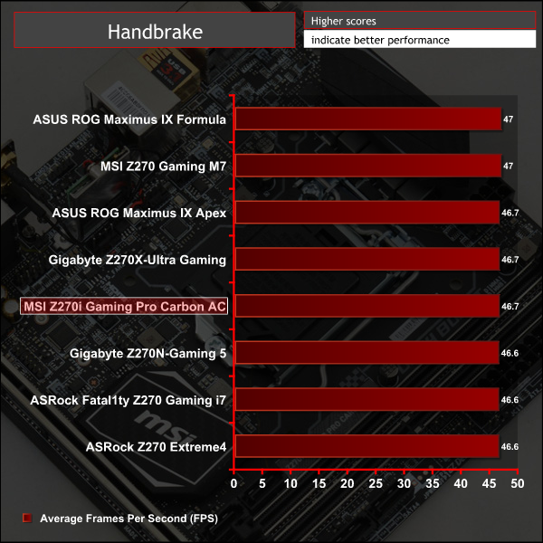 Handbrake is a free and open-source video transcoding tool that can be used to convert video files between different codecs, formats and resolutions. We measured the average frame rate achieved for a task of converting a 6.27GB 4K video using the Normal Profile setting and MP4 container. The test stresses all CPU cores to 100% and shows an affinity for memory bandwidth.