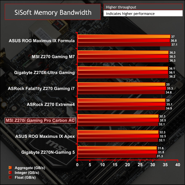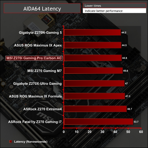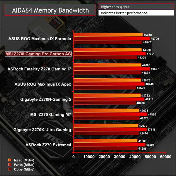 The memory performance aligns with all other Z270 motherboards that could only support two DIMMs (ASUS ROG Maximus IX Apex and Gigabyte Z270N-Gaming 5).