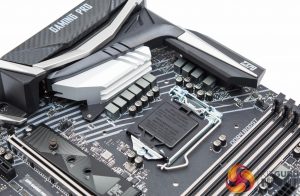The VRM setup is not too dissimilar to that of the Z270 Gaming Pro Carbon with 10 phases for the CPU socket area. We identified a uP9508Q 3+2 (VCore+VccGT) phase PWM controller which is likely being doubled by a nearby uP1961S – both units are provided by uPI Semiconductor.