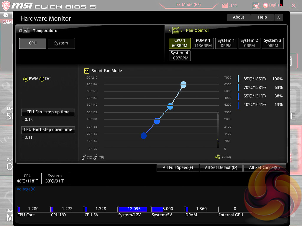 The fan controls are adequate for this motherboard allowing you to change the temperature source for each temperature-guided fan profile and the step up time between each of the adjustment thresholds. My only concern is that there isn’t an easily accessible set of fan profiles – there’s a default (auto-type) option or full speed. Some more traditional fan profiles like Quiet, Normal, Turbo and Full-Speed would be well founded.