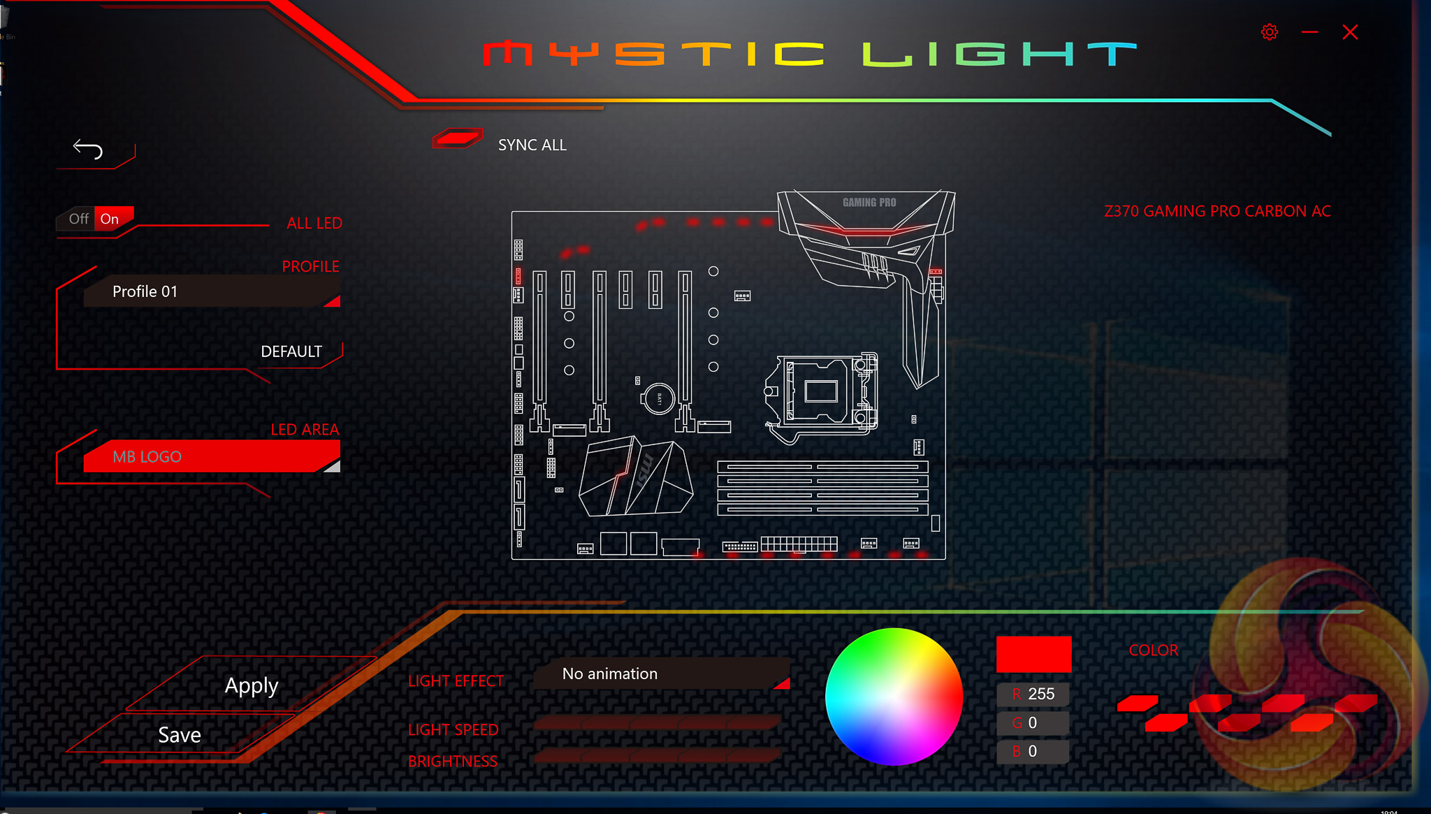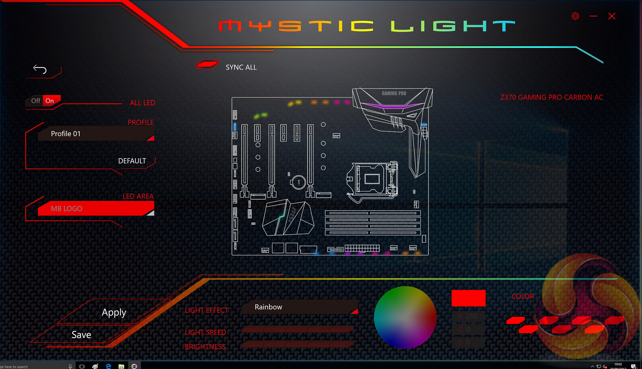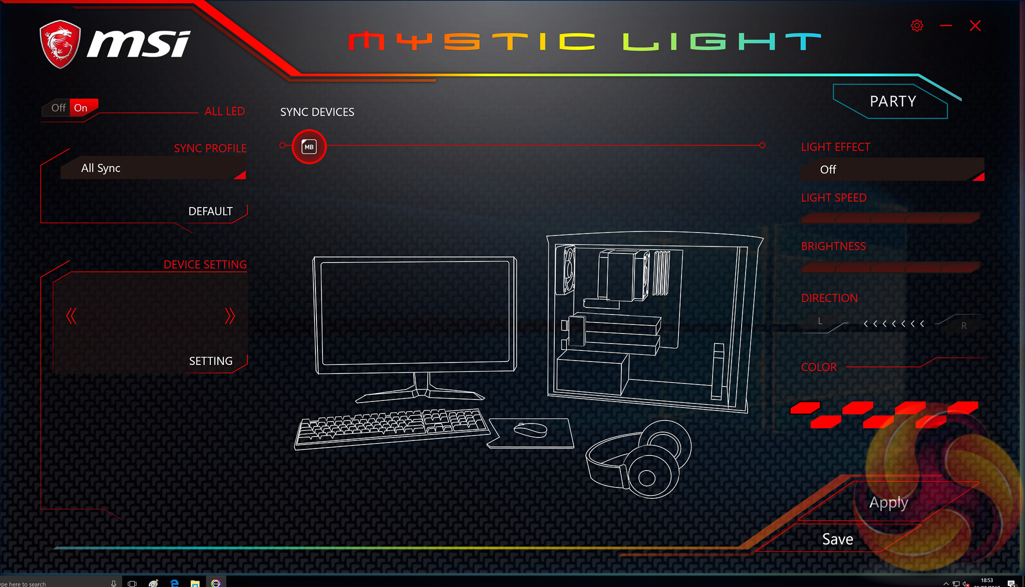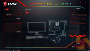 However, even though the range of modes and colours is good we found the application to be buggy and after launching into the second window (Device Setting -> Setting) and returning to the home screen, it was not possible to get back into that second window (Device Setting -> Setting) in the same session without terminating the Mystic Light application and Service and restarting them both.