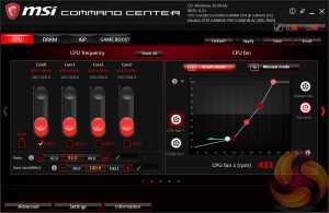 Command Center is the Windows performance tuning software for the MSI Z370 Gaming Pro Carbon AC with on-the-fly overclocking tools for the CPU, DRAM and iGPU, as well as fan controls. The virtual Game Boost button can also be toggled from within here but we find for the effort required users are better off doing some quick research to overclock their CPU since MSI has to overestimate the voltage to account for variations across all CPUs which usually results in considerably more voltage than is necessary being applied.