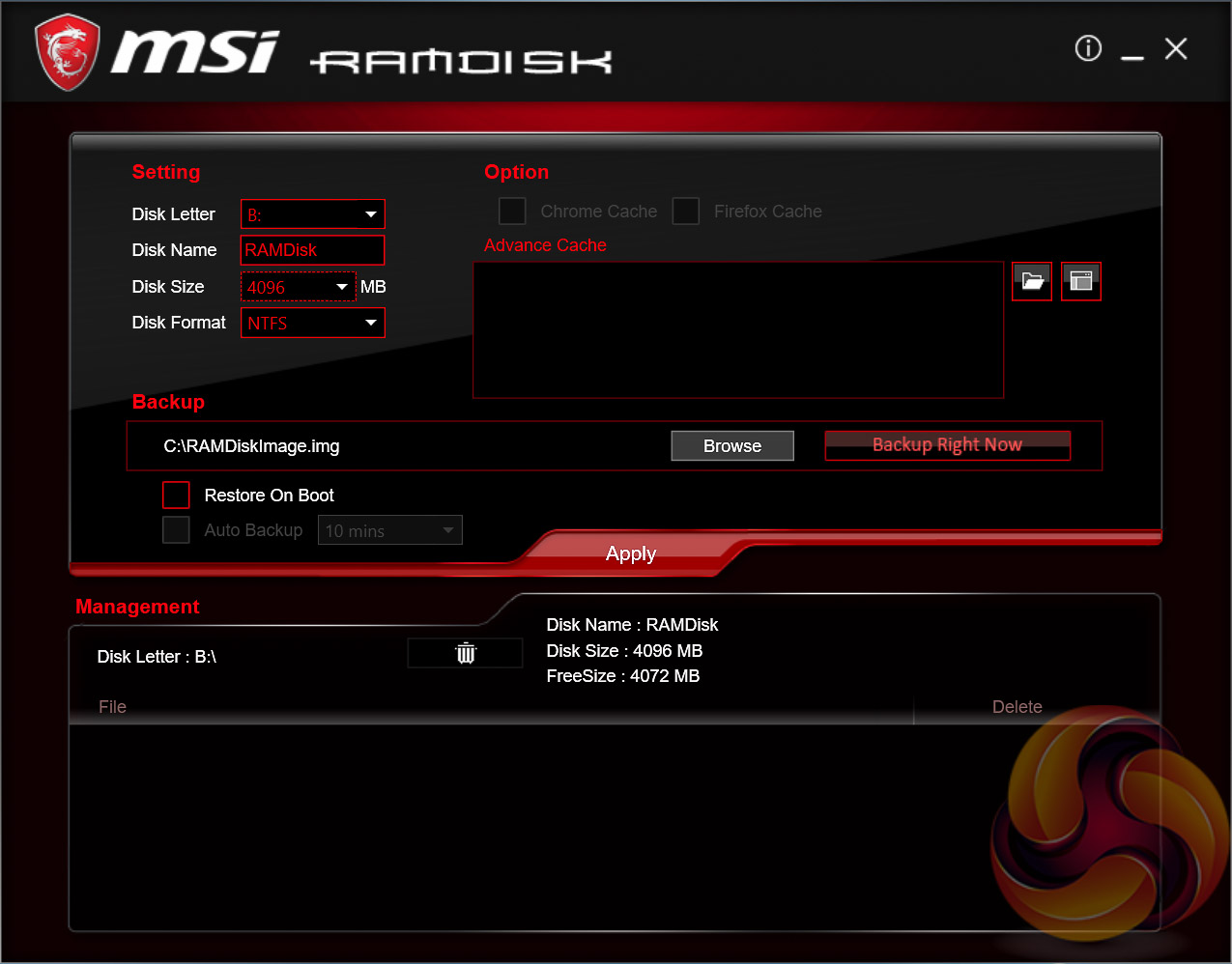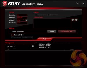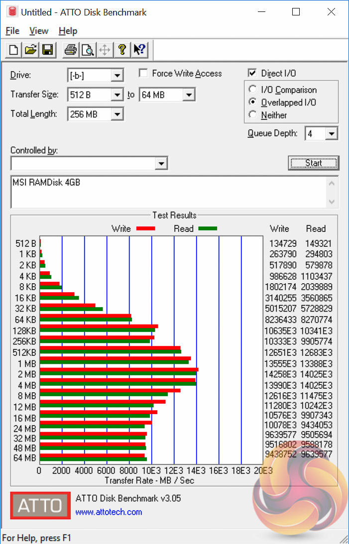 RAMDisk is probably more useful on X299 where up to 128GB of RAM is supportable making RAM Disks of genuinely useful capacities possible. However, we were still able to test with a 4GB RAM Disk (leaving 28GB of system left over for “other things”. We did a quick test this time around of the subsequently created RAM drive (B:) and it delivered impressive speeds of around 14GB/s, for reference the fastest M.2 NVMe drives will do around 2.8GB/s.