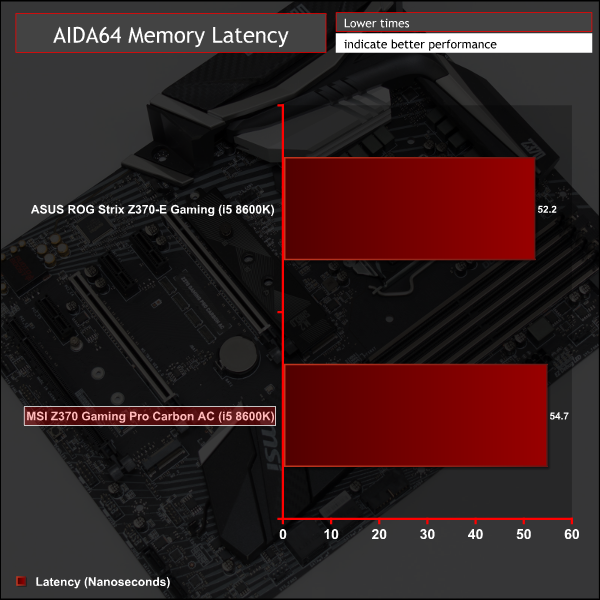 Similar Z270 memory testing, albeit with the i7 7700K @ 4.5GHz all-core Turbo, reaped about 41-49,000 MB/s across a range of motherboards in AIDA64 and 32 to 37 GB/s in SiSoft Sandra memory test. Latency appears to have gone up from 44-48ns but that could we be differences in the CPU frequency and Hyper-Threading related. Hence why legacy Z270 results have not been included in this graph for direct comparison.