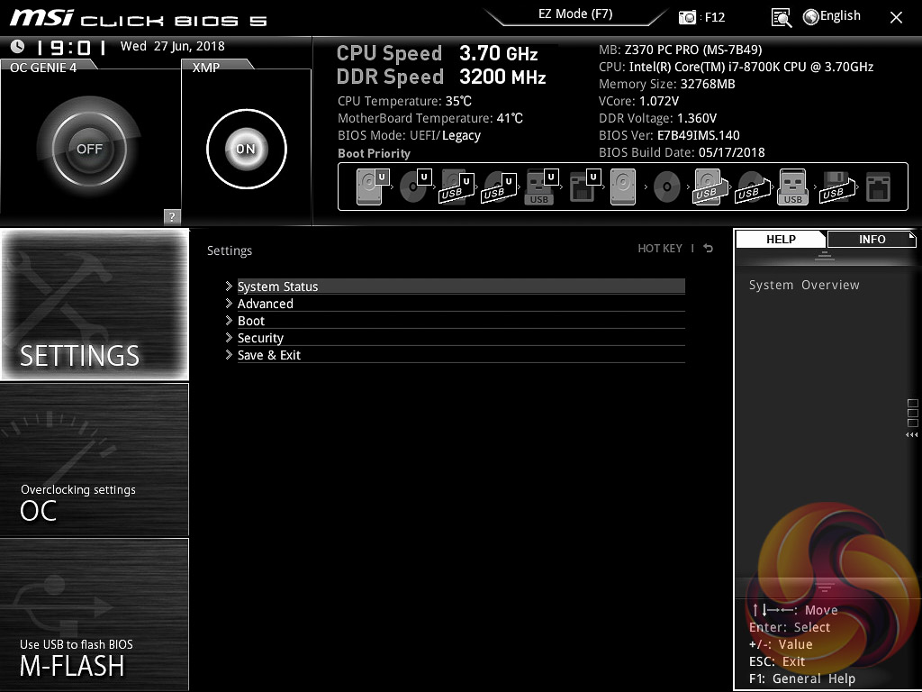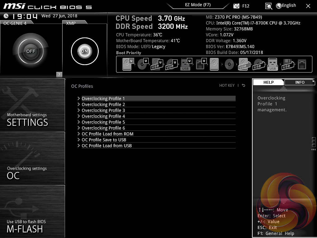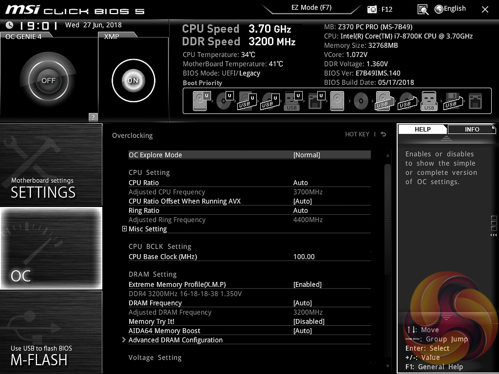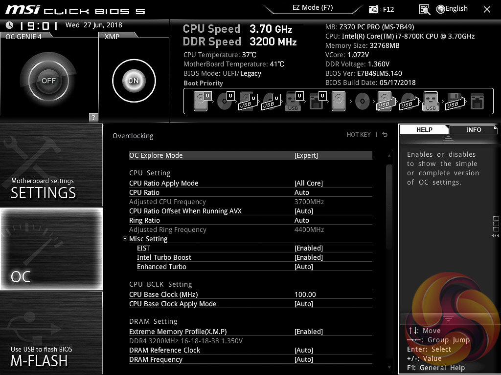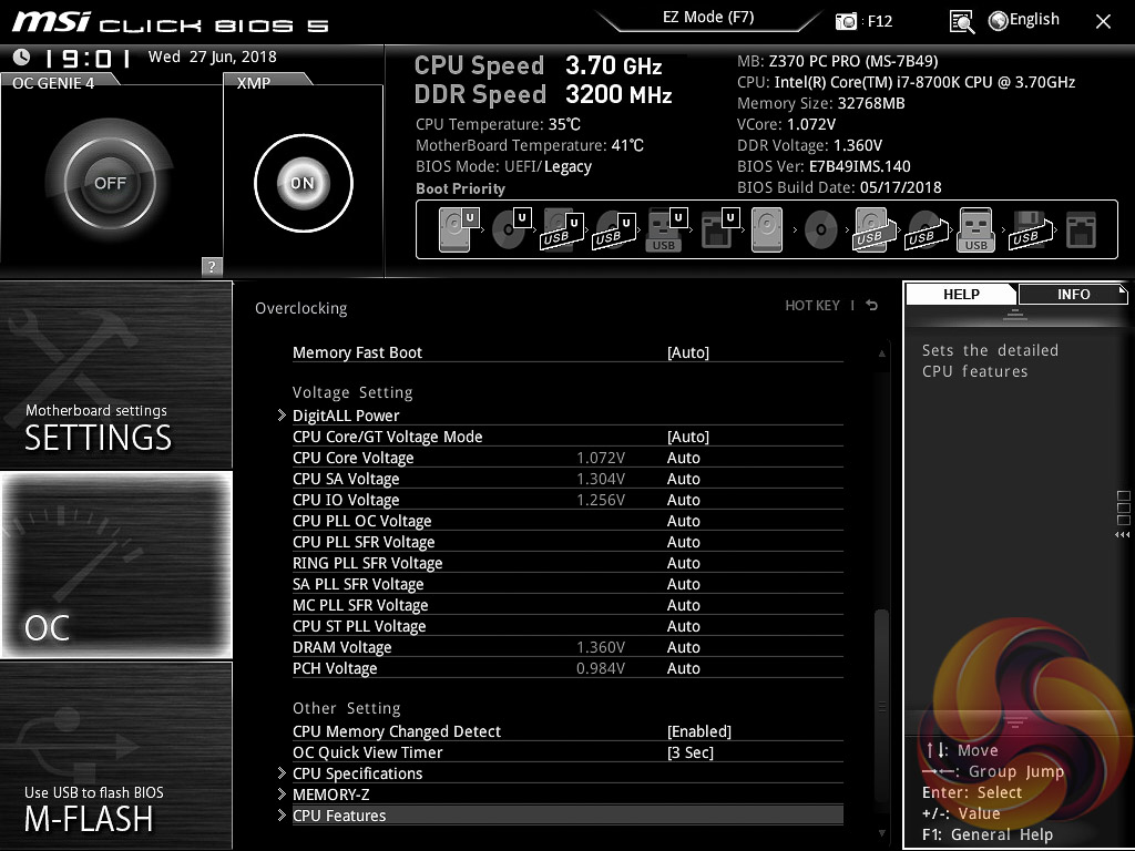 MSI’s UEFI has remained relatively consistent across its range of high-end motherboards for Intel platforms for the last few years. The MSI Z370 PC Pro sports version 5 of MSI’s Click BIOS which launches into an EZ Mode splash screen with an option to head into the advanced mode with the press of F7.
