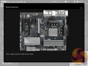 The last two tiles of the MSI UEFI refer to visual tools. Board Explorer is a visual interface for seeing what is connected to the various sections of the motherboard and some information about those connected entities. Hardware Monitor has more practical use in that it’s the primary method of changing fan profiles within the UEFI environment for each of the six fan headers.