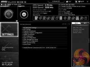 Settings has a number of useful settings for booting and integrated peripherals. The Advanced entry has the most sub menus and options to play with including the ability to toggle various different compatibility modes for storage and USB devices.