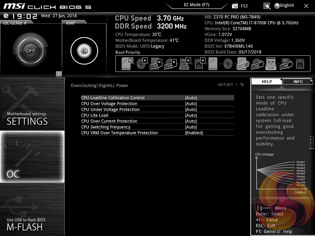 The range of LLC options is extensive too, with Mode 1 (most aggressive) to Mode 8 (least aggressive) as well as an option for no overvolting, which is even less aggressive on the voltage than Mode 8. From our testing mode 4 offered almost perfect voltage stability under load, mirroring the voltage specified in BIOS, while auto actually delivered the same behaviour. The visual diagram MSI provides within the BIOS is useful in ascertaining the behaviour of each CPU LLC mode.