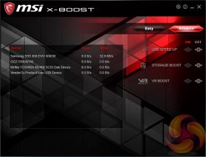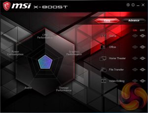 X-Boost seems to be a new MSI utility which functions similarly to something like the ASUS EPU/TPU power & performance profiles. MSI offers five different profile presets (Game, Office, Home Theater, File Transfer, Video Editing) which adjust the priority given to one of five key areas (CPU Performance, Graphics Performance, Storage Performance, Audio or Power Consumption).