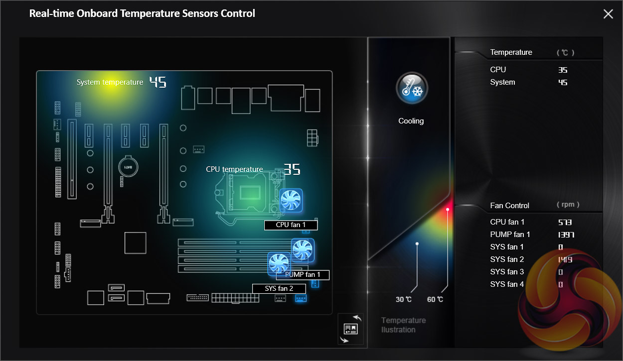 Under the Advanced sensor settings there is a nice visualisation provided of temperatures across the motherboard, there’s also more detailed recording and monitoring functionality available including system alerts under the Setting and Information sections.