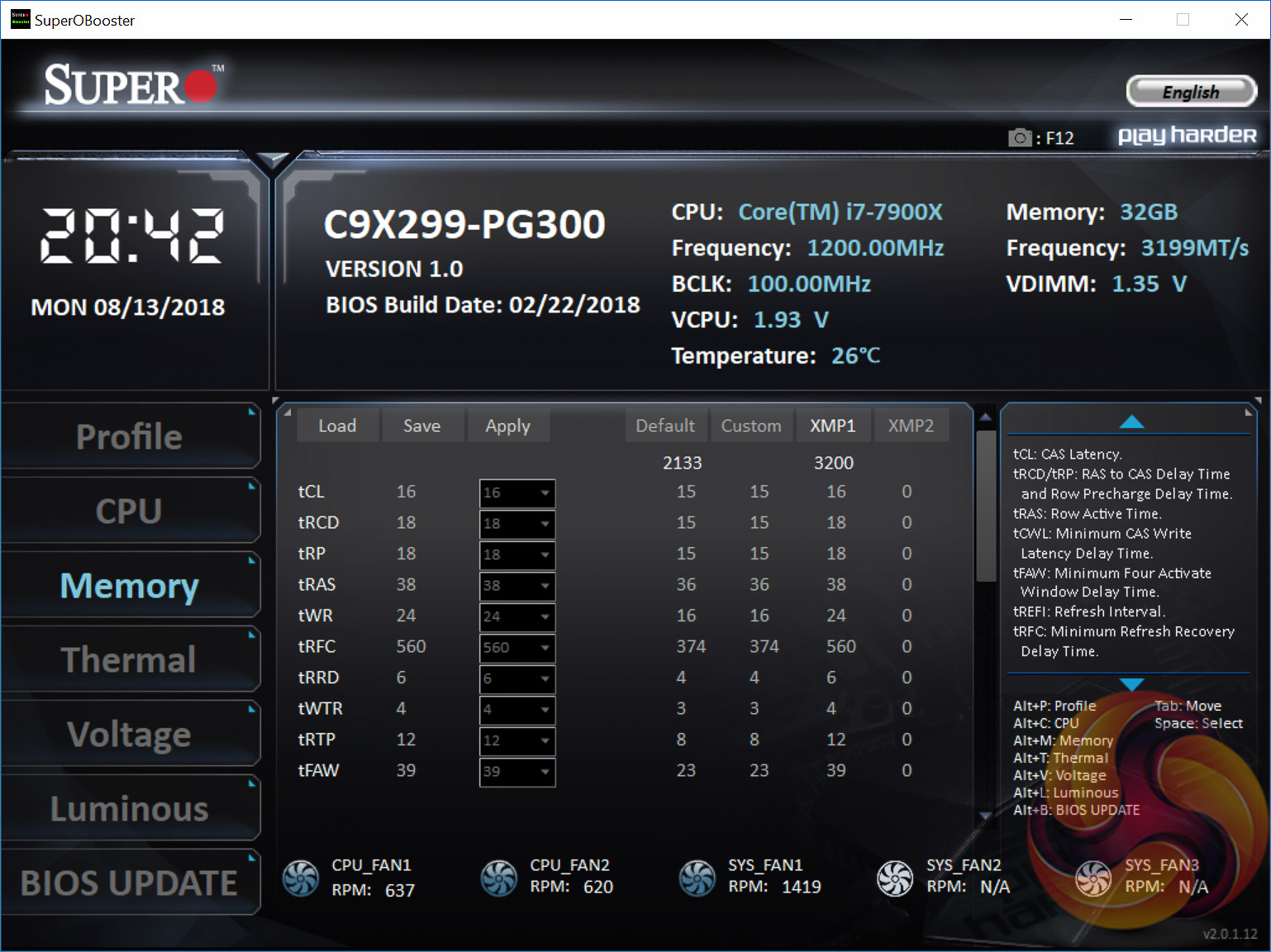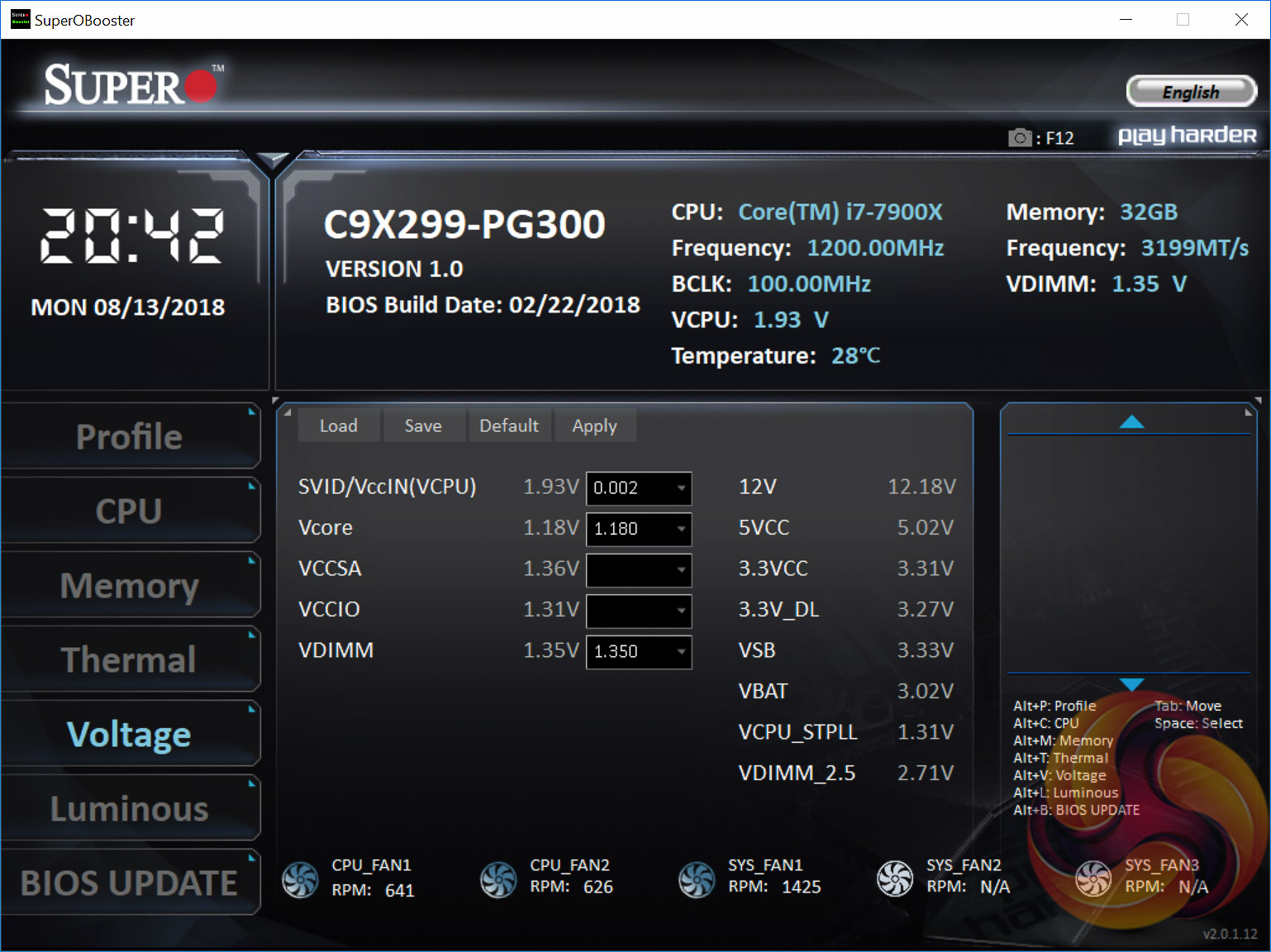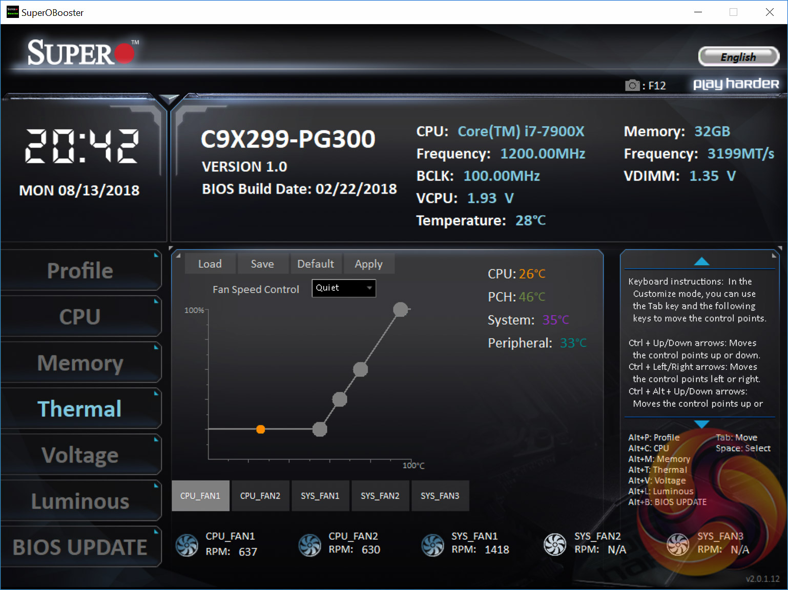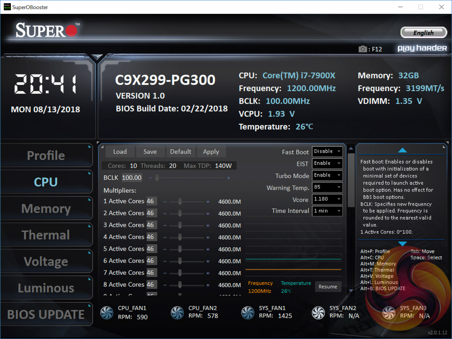 Supermicro's SuperO Booster software is the main software package for the Supermicro C9X299-PG300. It is a somewhat similar idea to the likes of ASUS AI Suite, ASRock A-Tuning/F-Stream, Gigabyte EasyTune and MSI Command Center, except better unified. Supermicro earns credit for convenience since all its relevant and useful functionality sits inside this single software package.