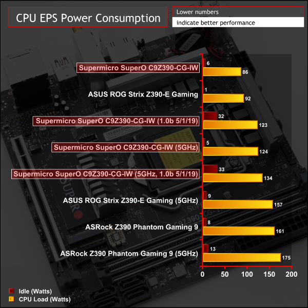 Even after implementing Supermicro's UEFI update the relationship between EPS and CPU Package power consumption did not change. In all scenarios the package power consumption was higher than the EPS 8 pin power consumption, which doesn't make a great deal of sense. It was also observed that the new UEFI update increase idle power consumption by quite a significant amount, we could identify no explanation for this change.