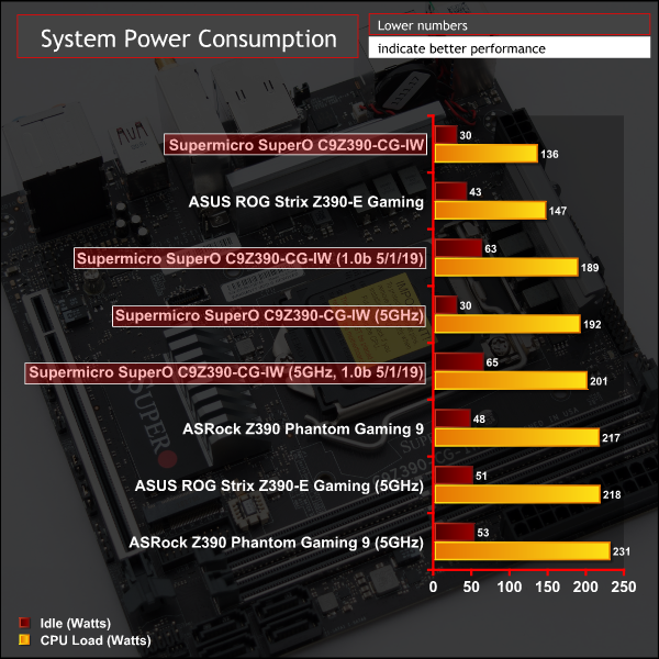 Power consumption was very low across the range of tests for the Supermicro motherboard. Part of this is down to the smaller footprint of the motherboard but also part may be down to Supermicro being more aggressive with power management and Intel TDP adherence.