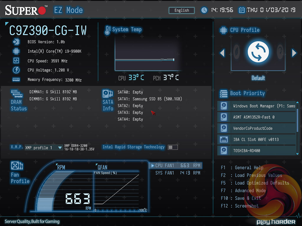 Supermicro's UEFI for its consumer SuperO gaming motherboards seems to be a work in progress. The iteration of that UEFI delivered with the SuperO C9Z390-CG-IW is similar to the C9X299-PG300 KitGuru tested late last year. Upon entering the UEFI the user is greeted with an “EZ Mode” splash screen with various common options like XMP, Boot Priority and summary information. Pressing F7 takes the user into the “Advanced Mode” of the UEFI.