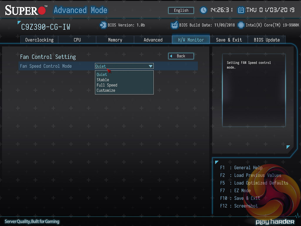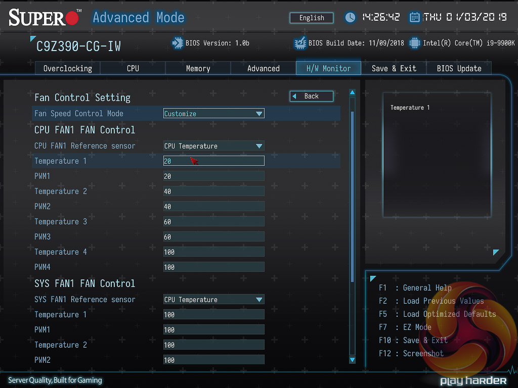 The H/W Monitor section holds the system monitoring data and fan controls. In the fan control section the setting needs to be set to “Customize” to allow the user to change the fan behaviour for each fan, each fan must be programmed manually and there are no default profiles. The “fan curves” have four temperature thresholds with four corresponding fan speeds, it is not possible to create smoother fan profiles than this or use any custom fan hysteresis settings (the time delay between speed changes).