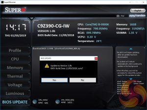 The BIOS Update section allows the UEFI to be updated directly from the Supermicro website within Windows. However, we noticed it didn't recognise when the version on the Supermicro website was already installed on the motherboard and it would “update” to the same version i.e. 1.0b to 1.0b. It should be smarter and detect when the version on the website is the same as the version already installed, and simply give a message saying “Your BIOS is up to date”.