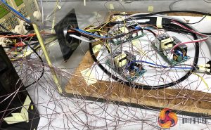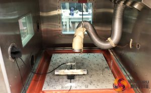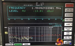 This happens in 2 parts. First is conduction testing – to make sure that energy is going through the wire and not exiting sideways. The second is the radiation test. Once the door to the radiation chamber is shut, the giant antenna can pick up signals from 3 metres away. In both cases, the test equipment is looking for less than a 6dB variance.