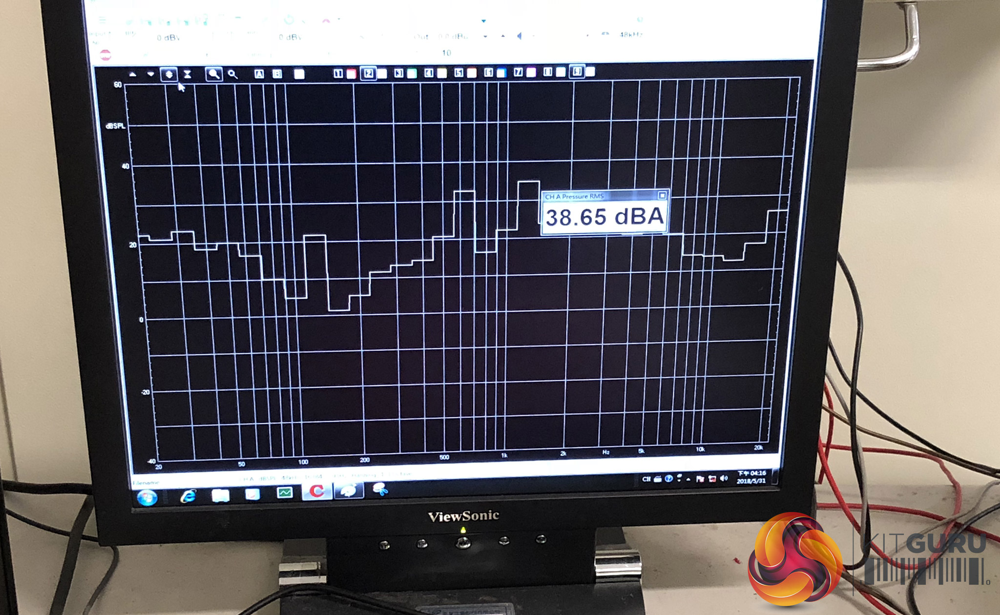 The unit being tested when we arrived was from the FSP ‘Twin' series, which pairs two PSUs together for redundancy. With two fans instead of one, this is arguably one of the louder set-ups possible. The measurement of 38 dBA is taken by a sensitive microphone positioned 1 metre away – and set at 30 degrees above the unit. Putting the PSU in a case would deaden a lot of that noise and putting the completed system under a desk would render it almost inaudible. Not as quiet as a fanless design, but pretty silent for a regular user. These shots show the test set up, the very thick door to the chamber and the output from dual PSUs.