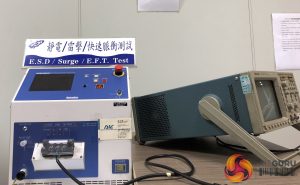 Lightning may not strike twice that often in the real world, but this test rig can zap up to 15,000 volts through a product whenever it's needed. The question being asked is ‘can a PSU pass EMS testing – before being killed?'. The second part of the surge test is EFT which varies the input AC voltage by +/-90 volts.