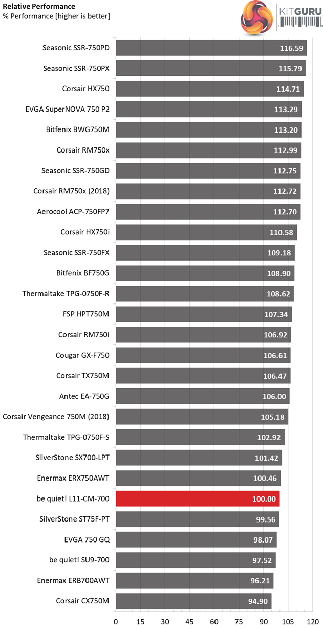 When it comes to noise output, the L11-CM-700 honors its brand's name since it is super quiet. Only the, more expensive, Corsair RM750x (2018) manages to outperform it in this section.