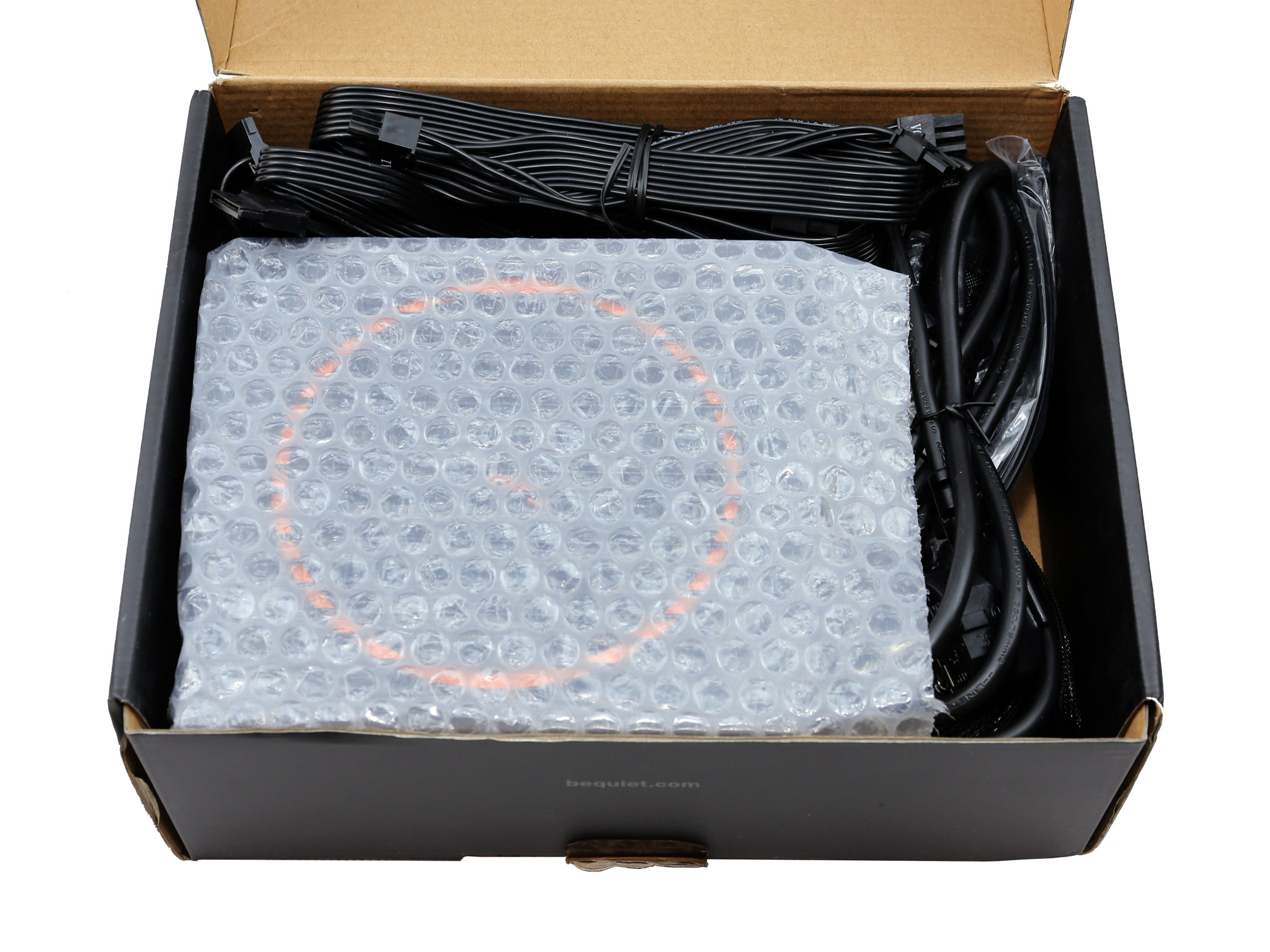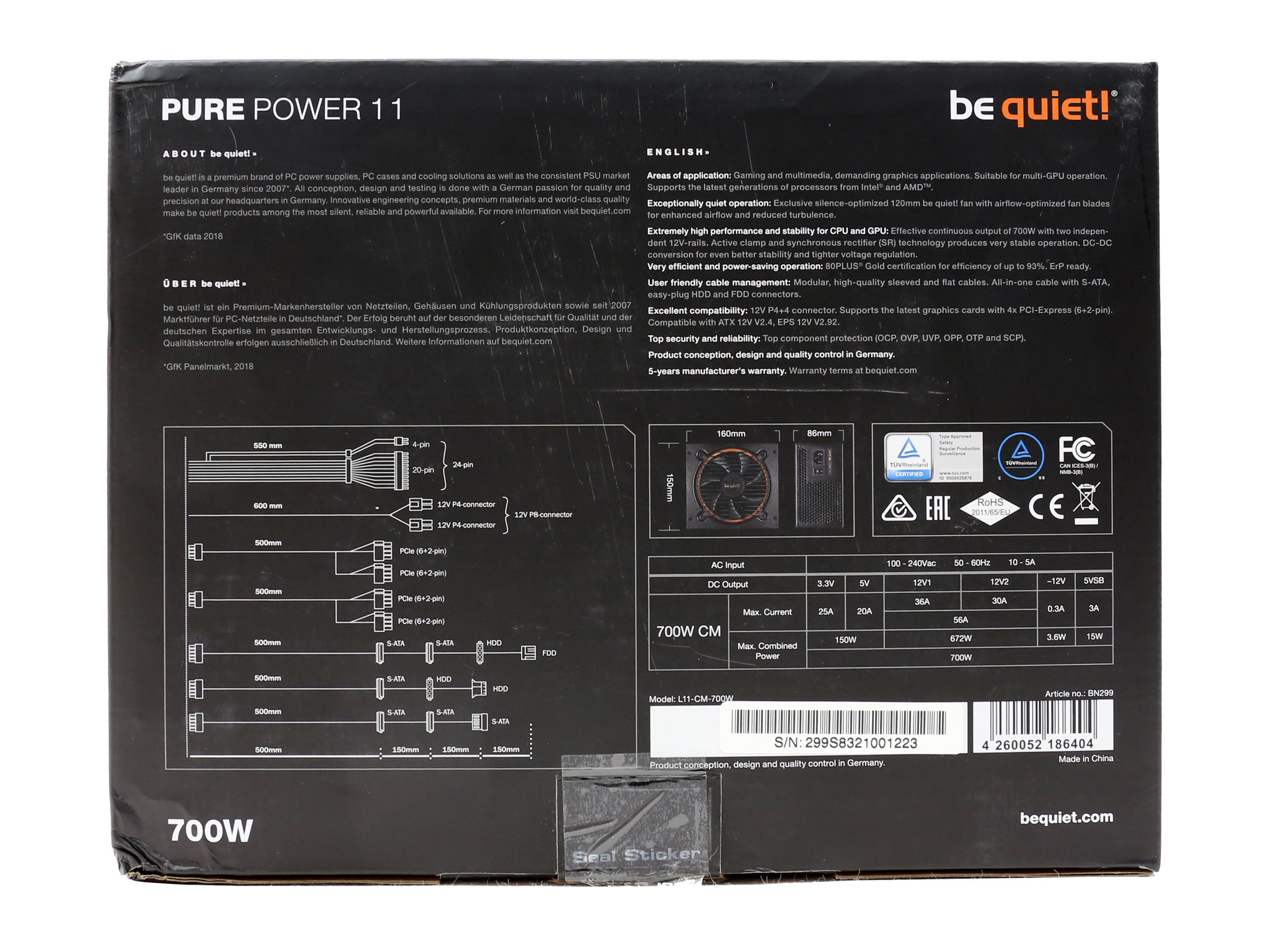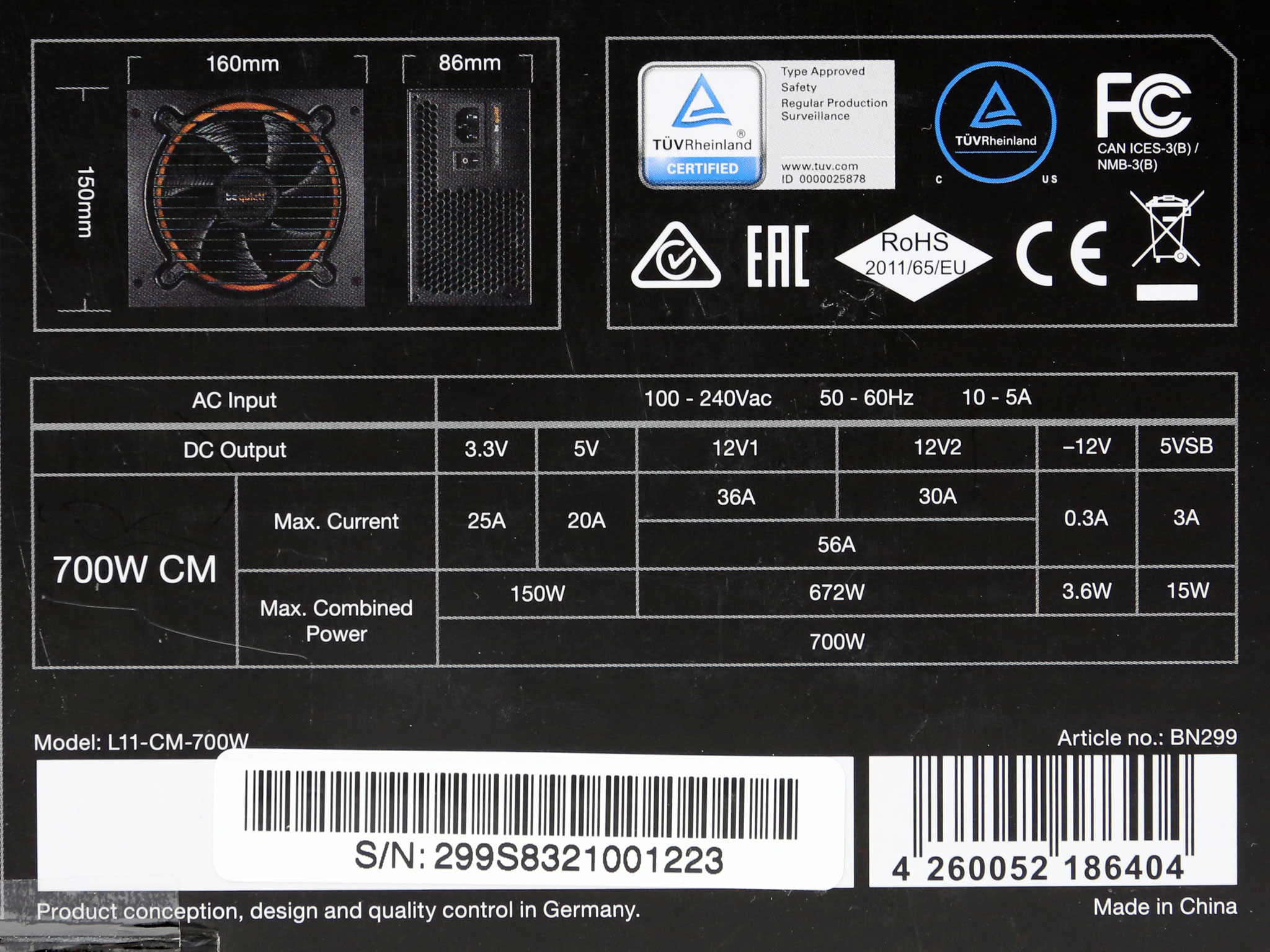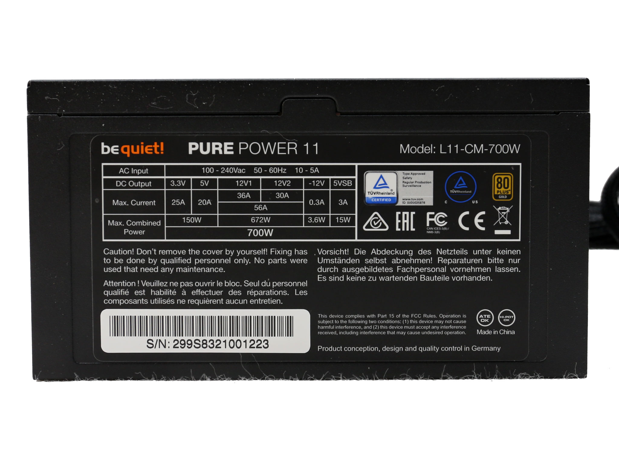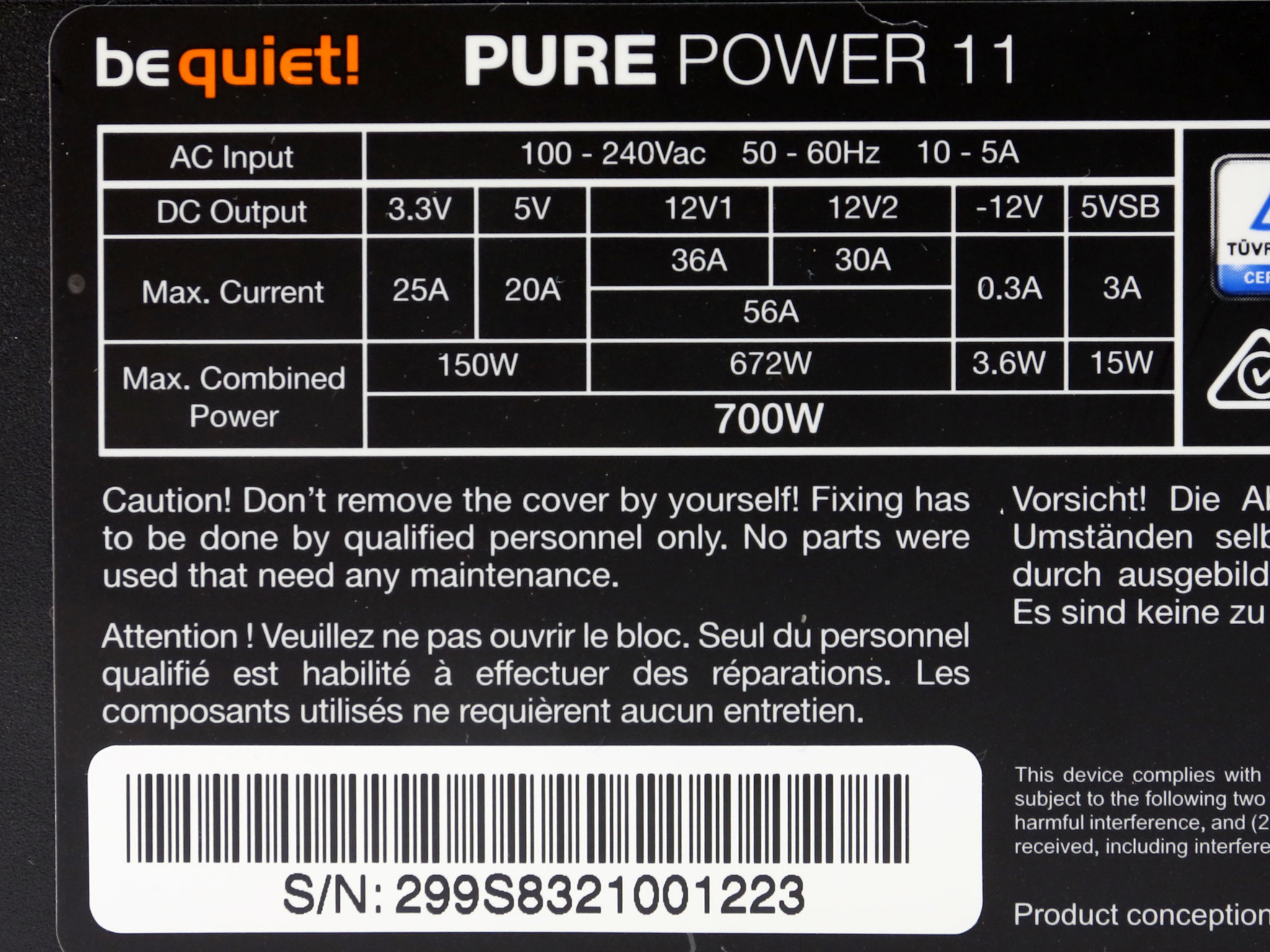 On one of the two sides we find a stamped be quiet! logo along with the warranty sticker, while on the other side is the large power specifications label, which also depicts the product's serial number.